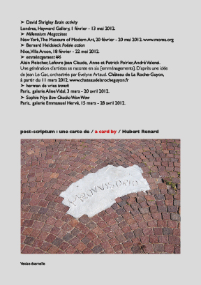 mardi 6 mars 2012 Publié le avril 10, 2013 par cdla mardi 6 mars 2012 – newscard #8 (une carte de/a card by Hubert Renard) Partager : Cliquez pour partager sur Facebook(ouvre dans une nouvelle fenêtre) Facebook J’aime chargement… Similaire