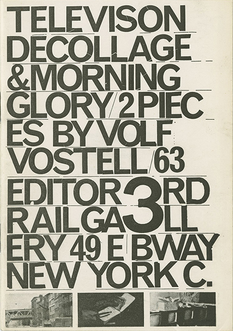 Wolf Vostell Publié le août 10, 2017 par cdla Wolf Vostell TV-Dé-collage & Morning Glory / 2 Pieces by Wolf Vostell New York : 3rd Rail Gallery, 1963. – 40 p. agrafées ; 14,8 × 10,5 cm. – Imprimé en 1 couleur (noir). – Couverture illustrée, imprimée en noir. inv. n° 188 10 Partager : Cliquez pour partager sur Facebook(ouvre dans une nouvelle fenêtre) Facebook J’aime chargement… Similaire