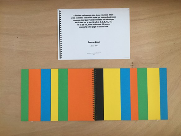 4 feuilles vert-orange-bleu-jaune répétées 3 fois avec au milieu une feuille noire qui inverse l’ordre des couleurs ainsi que l’ordre successif des découpes verticales sur le bord droit de 0, 3, 8, 12, 15, 19 et 26 cm, dans un livre de 30 pages, y compris cette page de couverture.