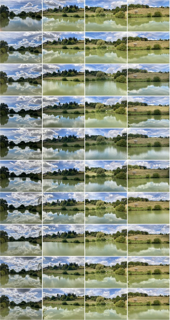 During our September 2022 Walking in Air event, I walked around a countryside pond. It was set in low-lying land close to a stream and to a field of cows grazing early on winter hay. When, I came upon the pond, I was struck by the way its surface dramatised the relationship between air and water: the way the reflection of the sky fuzzed whenever a breath of air disturbed the surface of the water. I walked 10 times round the pond, taking a photograph at the same four spots on each circuit. In this way, I recorded the slow changes in the cloud formations above.