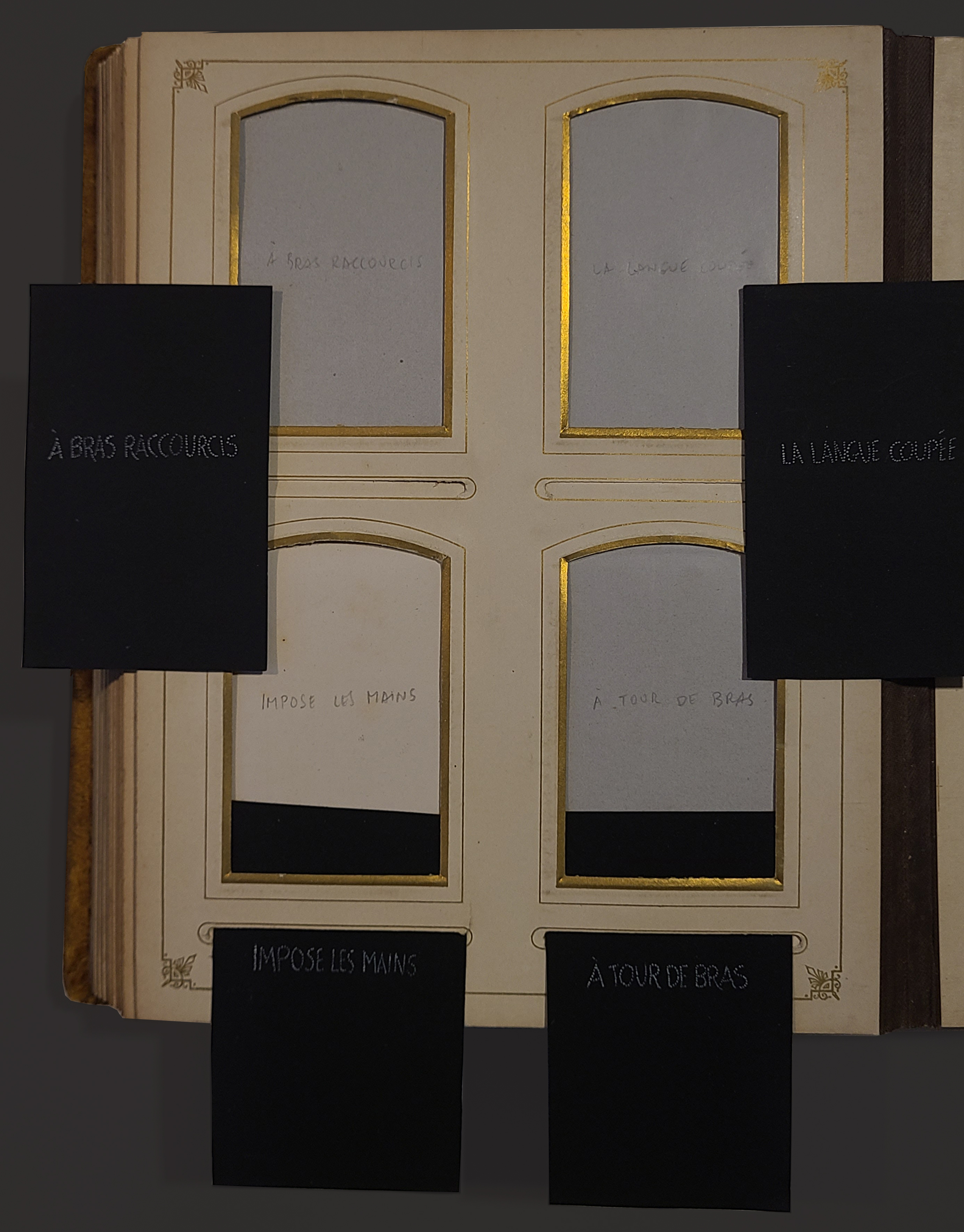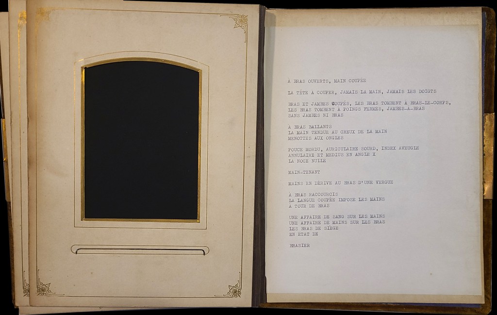 «À BRAS OUVERTS / MAIN COUPÉE [en fausse page sur une grande feuille de canson noir, avant la première planche de carton avec photographie] /// LA TÊTE / À COUPER // JAMAIS LES MAINS / JAMAIS LES DOIGTS /// BRAS ET JAMBES COUPÉS // LES BRAS TOMBENT / À BRAS-LE-CORPS // LES BRAS TOMBENT / À POINGS FERMÉS // JAMBES-À-BRAS / SANS JAMBES NI BRAS /// LES MAINS VIDES / JETÉES À PLEINS BRAS /// À BRAS BALLANTS / LA MAIN TENDUE / AU CREUX DE LA MAIN / MENOTTES AUX ONGLES /// POUCE MORDU //// AURICULAIRE SOURD /// INDEX AVEUGLE /// ANNULAIRE / ET / MEDIUS / EN ANGLE X / LA NOCE NULLE /// MAIN-TENANT /// MAINS EN DÉRIVE /// AU BRAS D’UNE VERGUE /// À BRAS RACCOURCIS /// LA LANGUE COUPÉE /// IMPOSE LES MAINS /// À TOUR DE BRAS /// UNE AFFAIRE DE SANG / SUR LES MAINS /// UNE AFFAIRE DE MAINS / SUR LES BRAS /// LES BRAS DE SIÈGE /// EN ÉTAT DE. /// BRASIER»