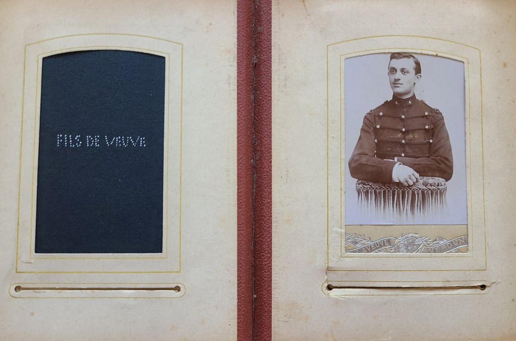 Si les deux dernières planches donnent à voir des familles, c’est bien la solitude potentielle de ces «FILS DE VEUVES» et «FILLES DE VEUFS» en puissance qui imprègne les photographies de cet album. Du moins, c’est ce que suggère ironiquement la signature laissée visible sous la première photographie de soldat : «LAVEUVE VERDUN».
