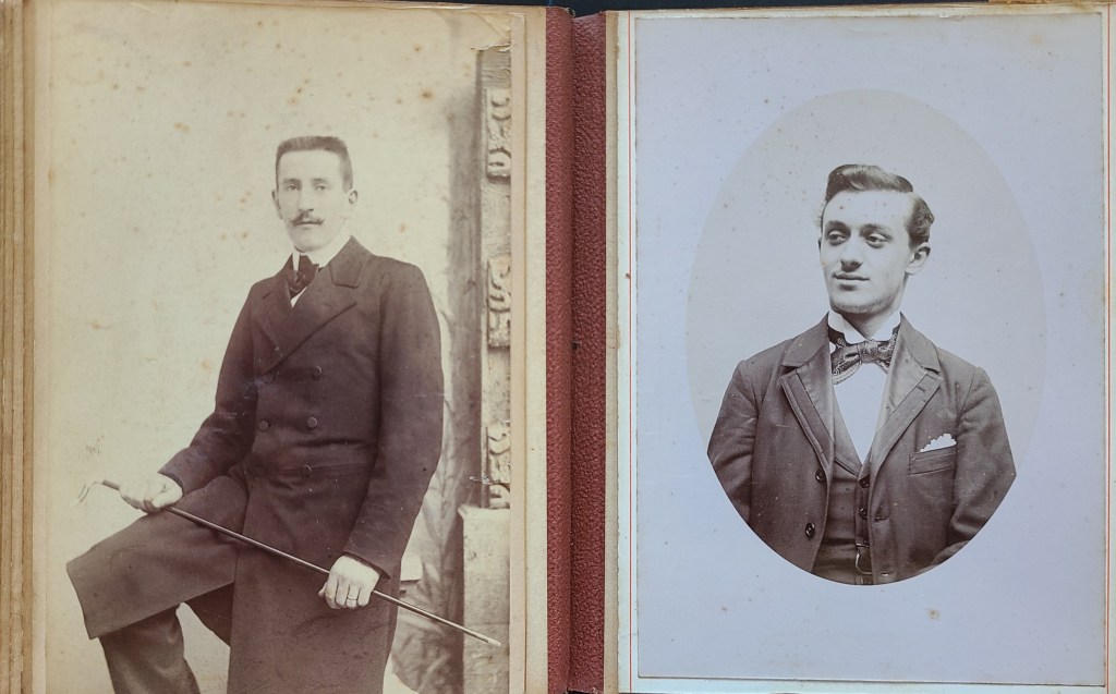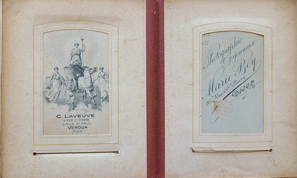 35 photographies fin XIXe siècle, dont 5 format cabinet, collées sur les planches, et 30 format carte de visite insérées dans les ajours, parfois collées dans leur position ; première photo collée dans l’ajour, excentrée, laisse paraître carton gaufré argenté, «laveuve verdun» ; une double page comprend un portrait ovale d’enfant, collé sur Canson noir apparent, et un portrait de jeune femme, collé à l’encadrement et sur un Canson noir, plus petit format que les autres, positionné en bas du cadre, donne l’impression qu’il tombe de l’ajour ; portrait divers, photos de famille, de soldats, une vieille dame assise.