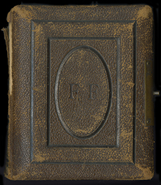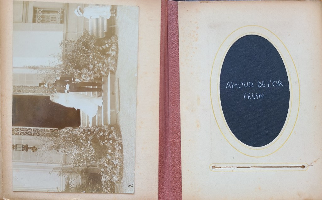 Couverture en cuir brun frappé, initiales «F.F» sur le premier plat, dos partiellement décollé, coiffe supérieure détachée, cuir usé ; fermoirs métalliques absents ; tranches dorées ; fenêtres encadrées par une dorure ; gardes en carton fin, doublé d’un papier blanc moiré et strié, deuxième garde de carton fin, «Album» calligraphié style victorien.