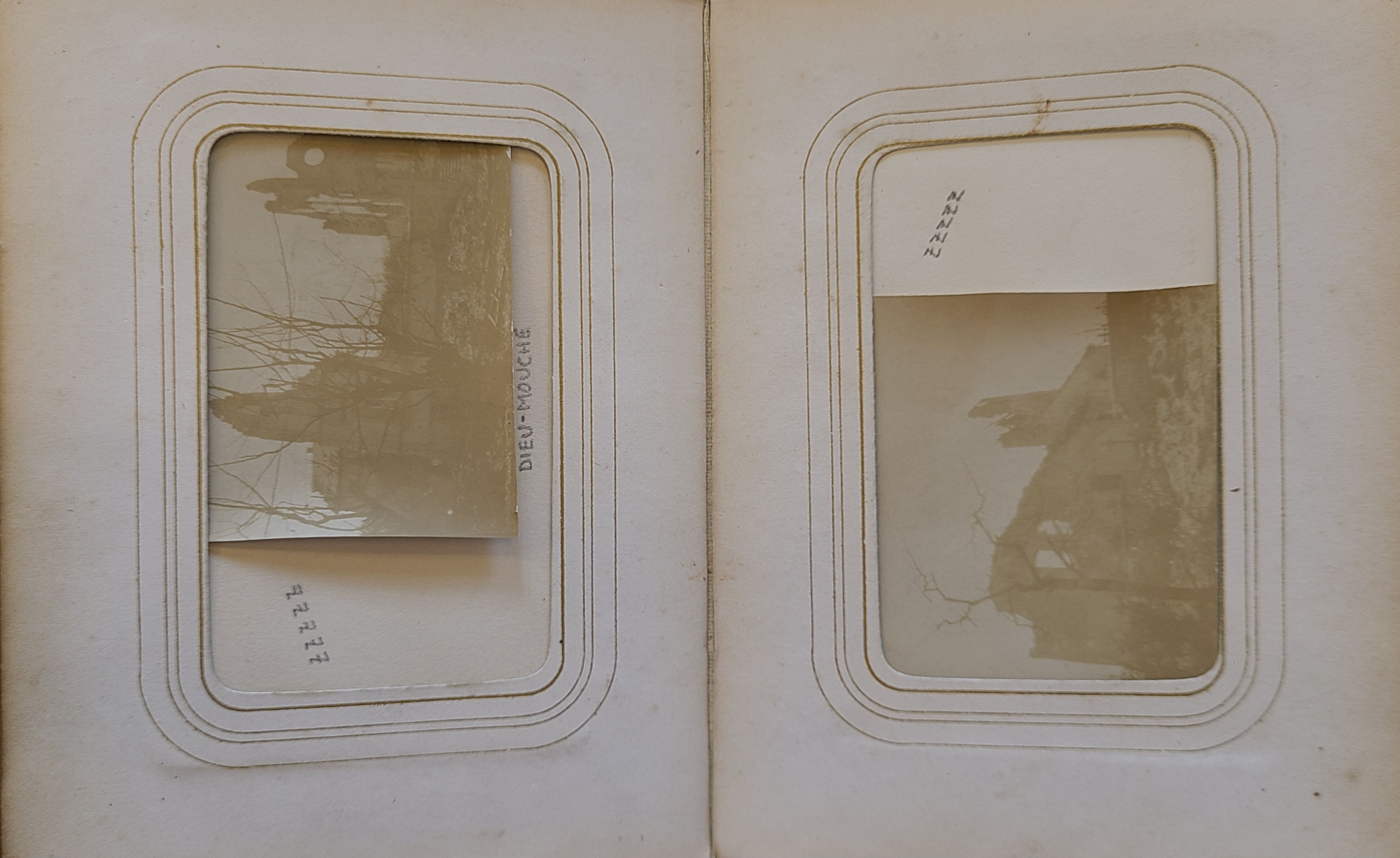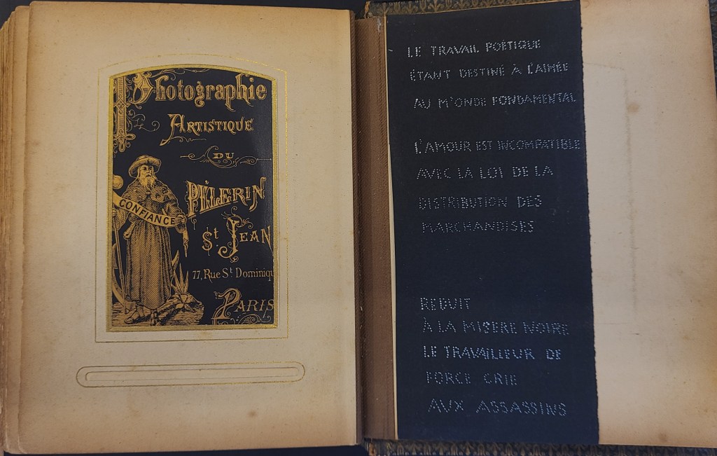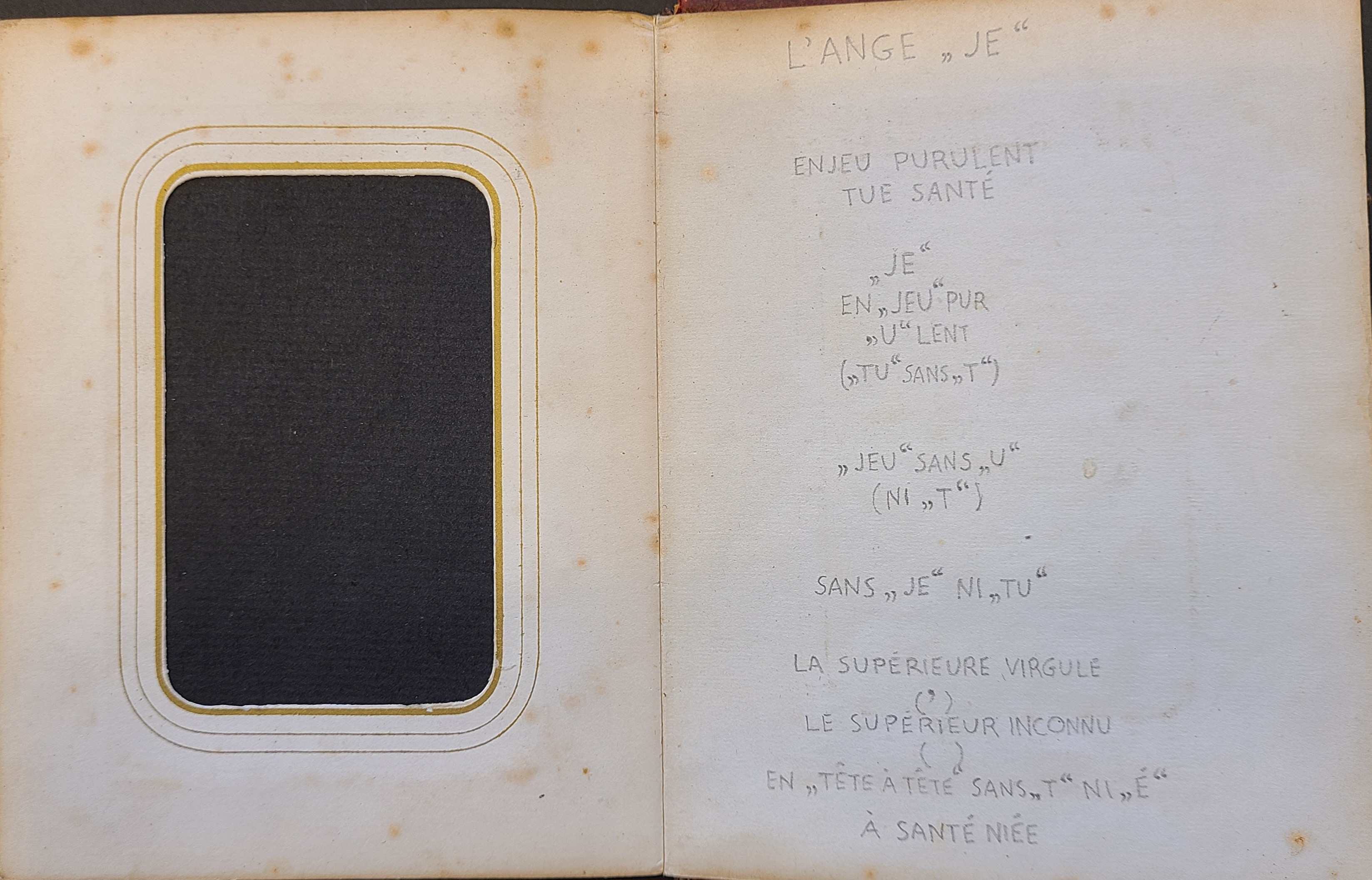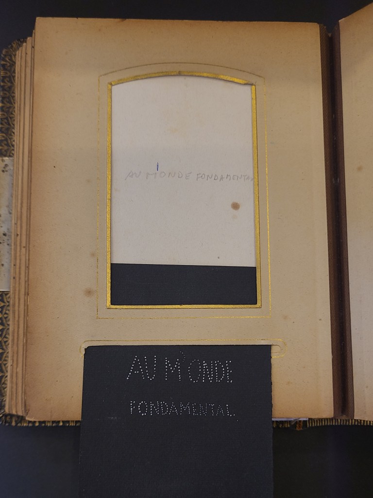 – 32 p. ; 23 x 19 x 6 cm ; (N’) – album photo, 34 clichés ; texte autographe, «aux petits points», lettres capitales, encre blanche sur Canson noir ; 27 dessins «aux petits points».
