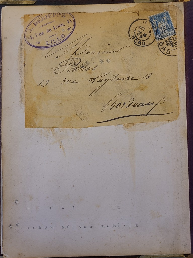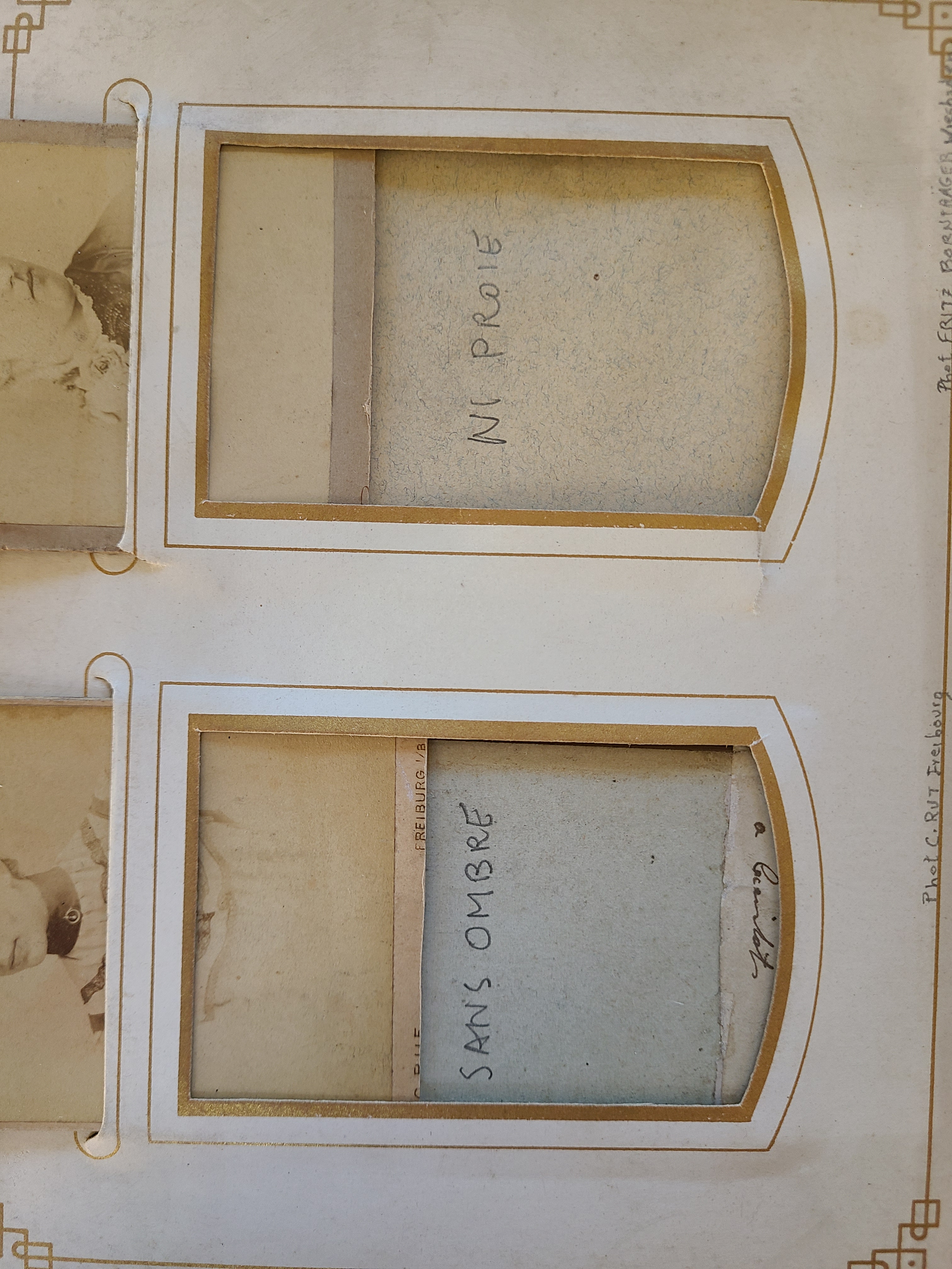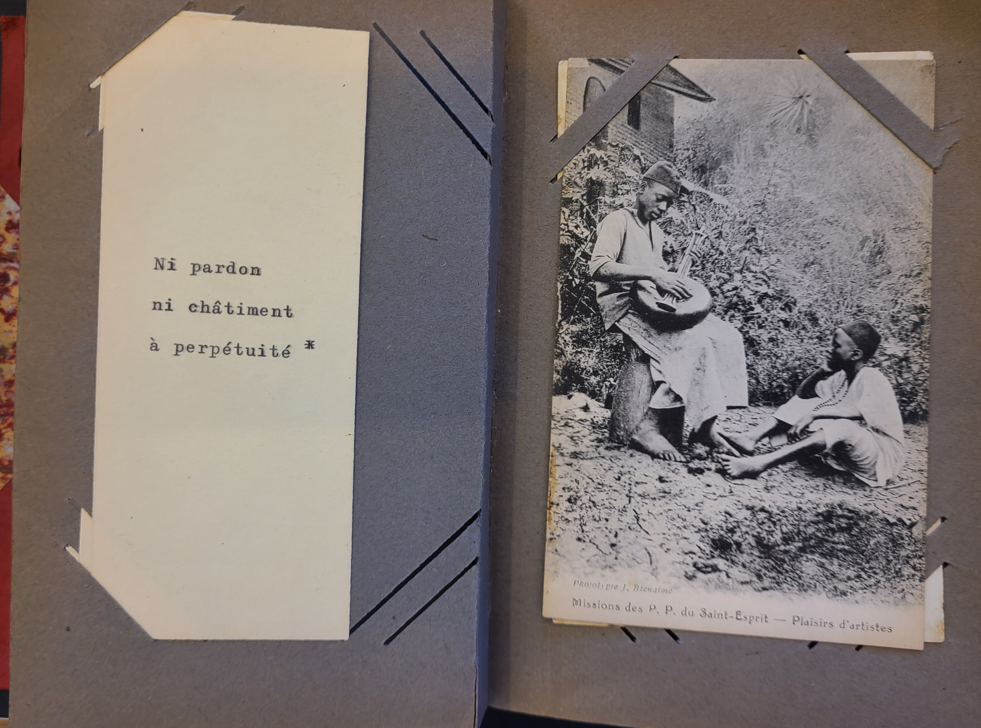 – 32 p. ; 23 x 19 x 6 cm ; (N’) – album photo, 34 clichés ; texte autographe, «aux petits points», lettres capitales, encre blanche sur Canson noir ; 27 dessins «aux petits points».