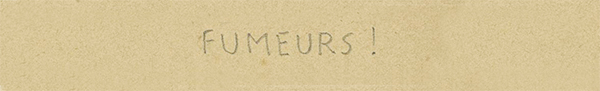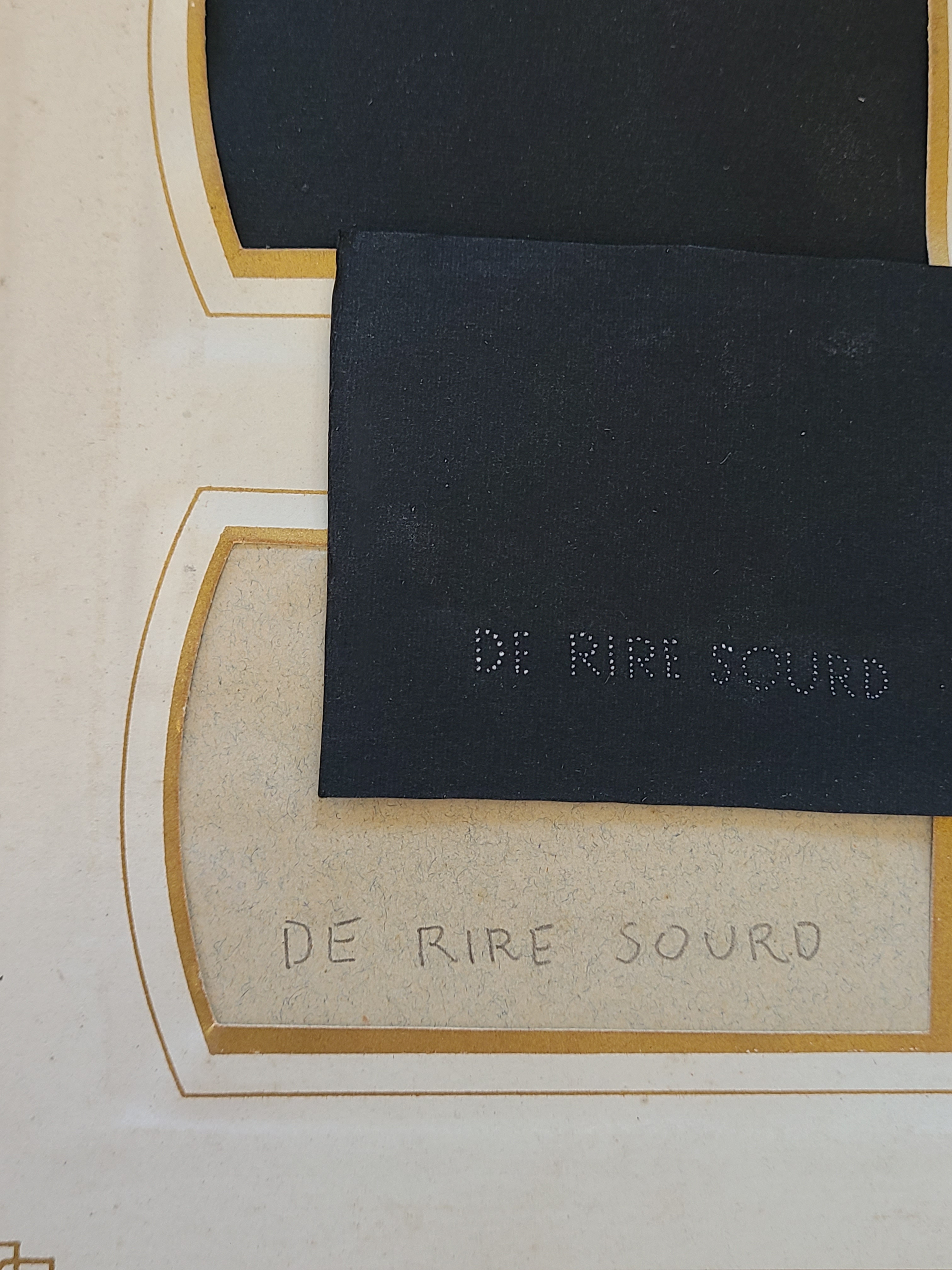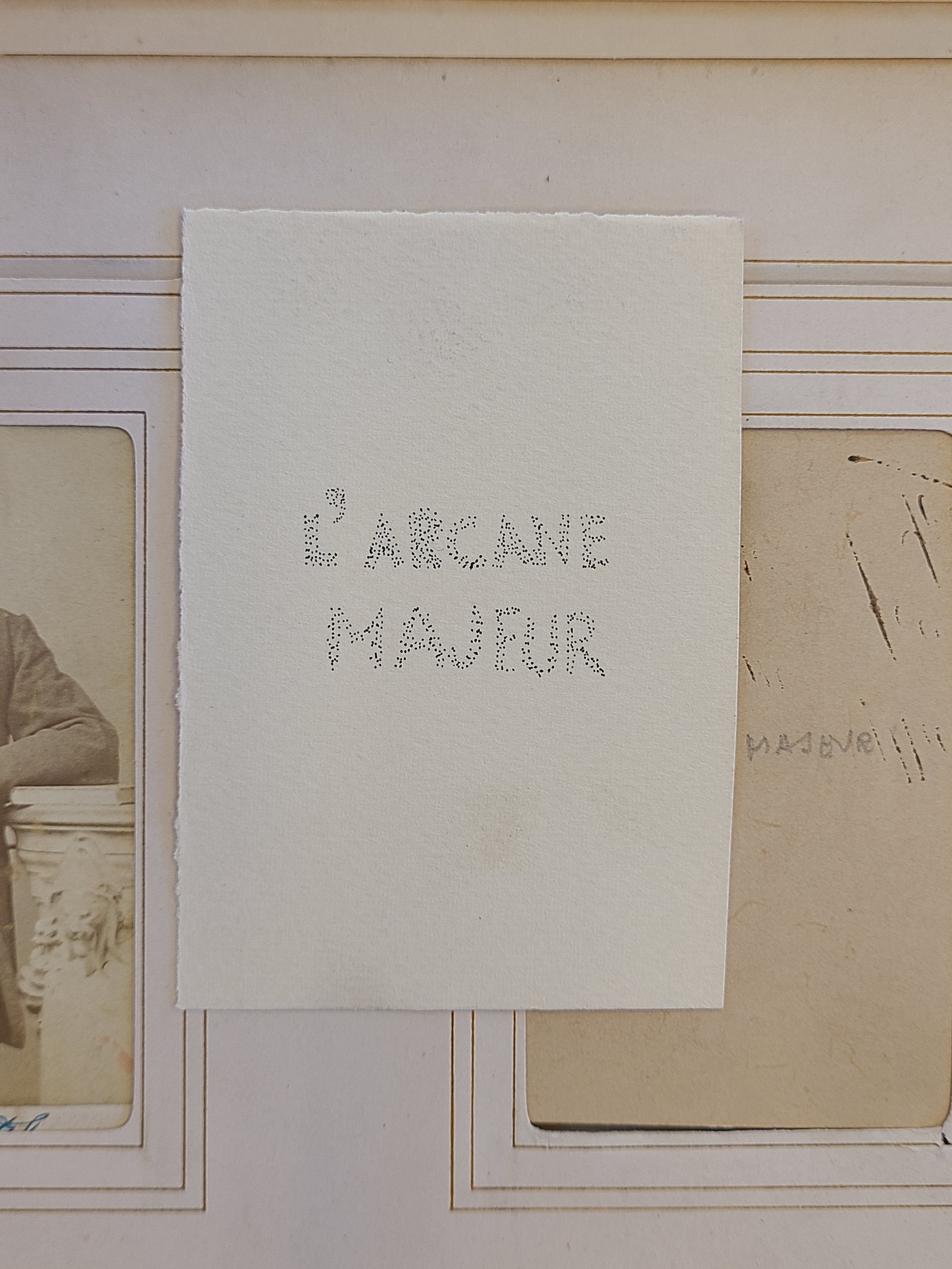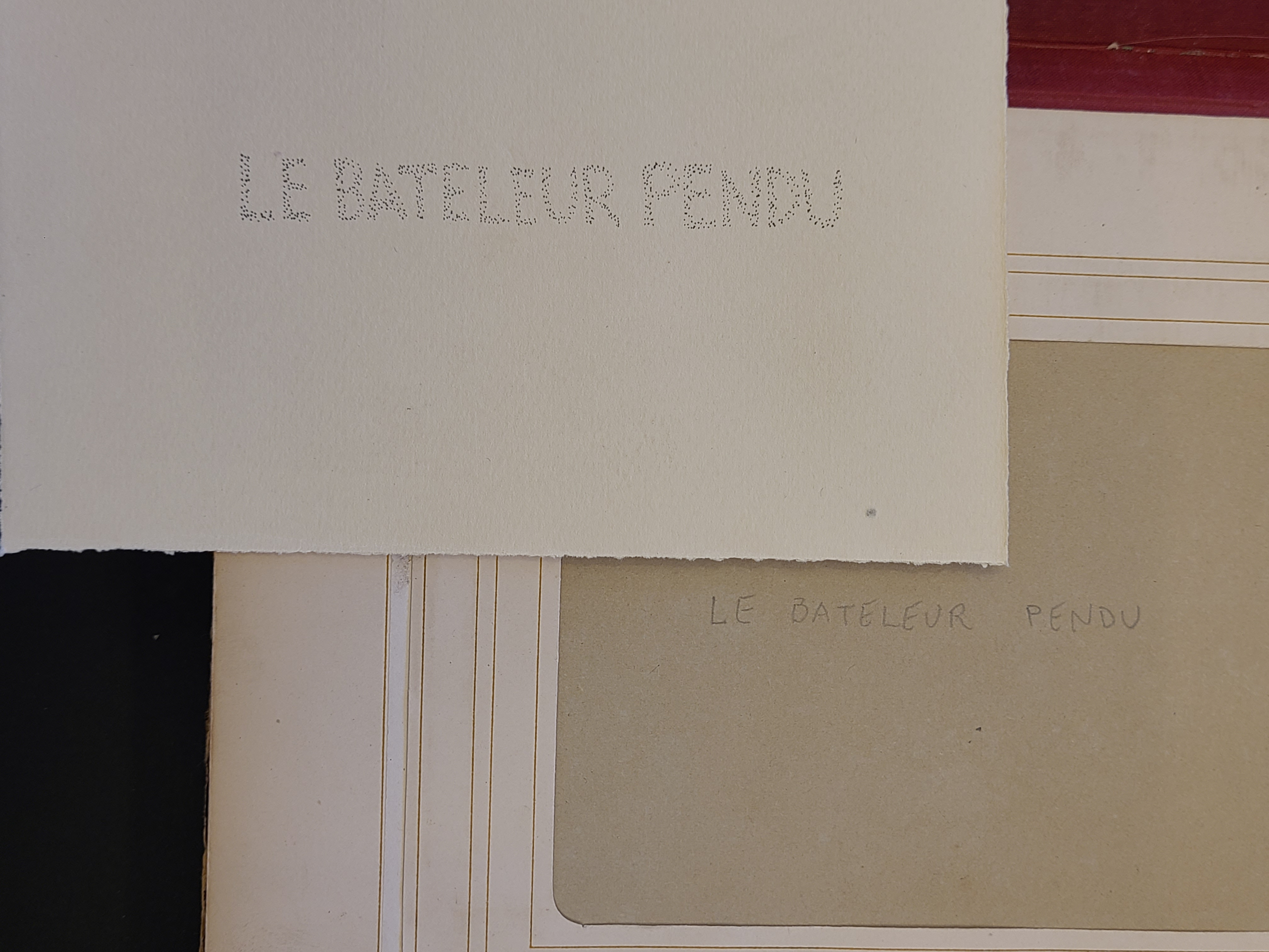 Textes autographes en capitales, «aux petits points», à l’encre blanche sur 16 feuillets de Canson gris granuleux, découpés au format carte de visite ou cabinet en fonction des ajours, variations entre caractère de corps gras ou maigre.