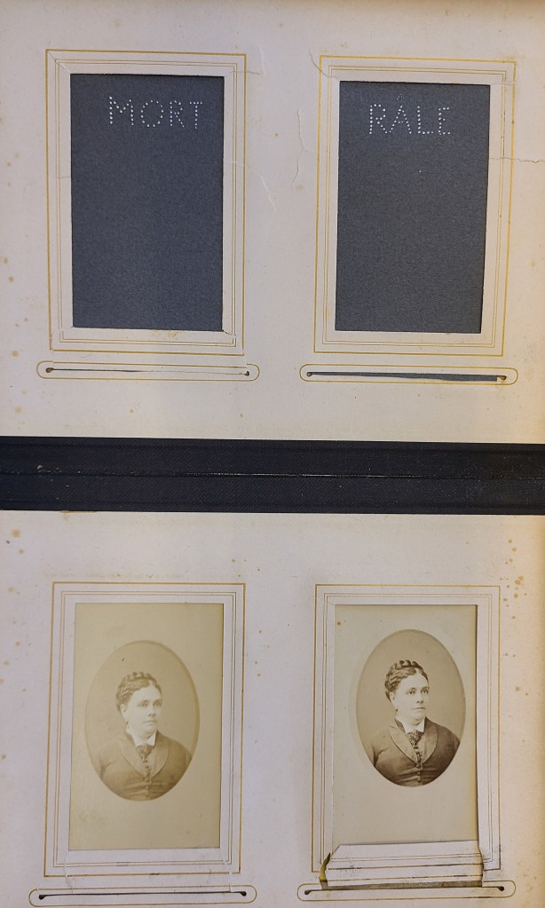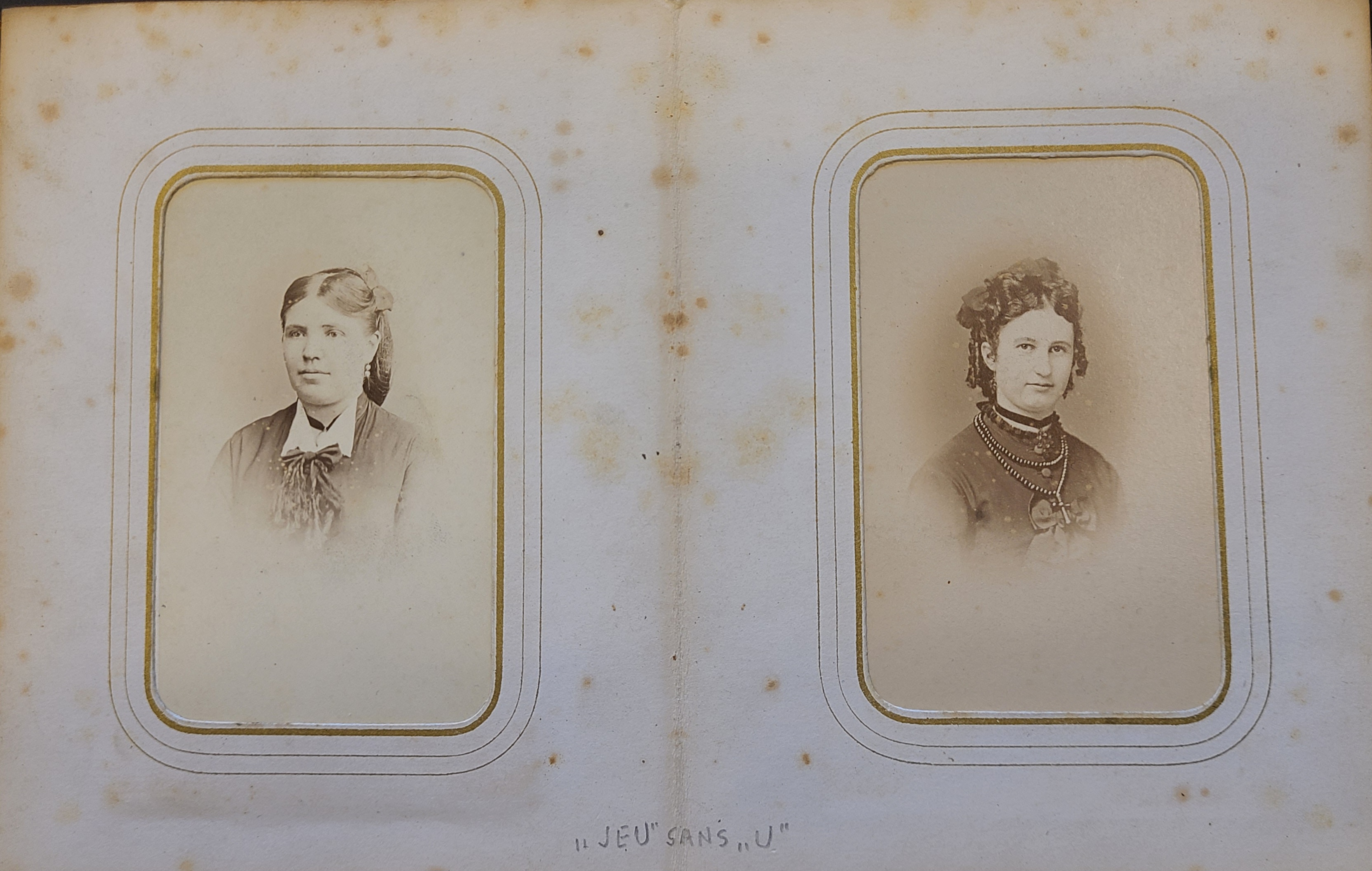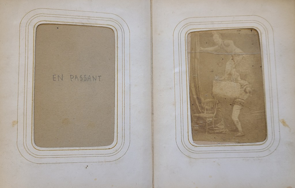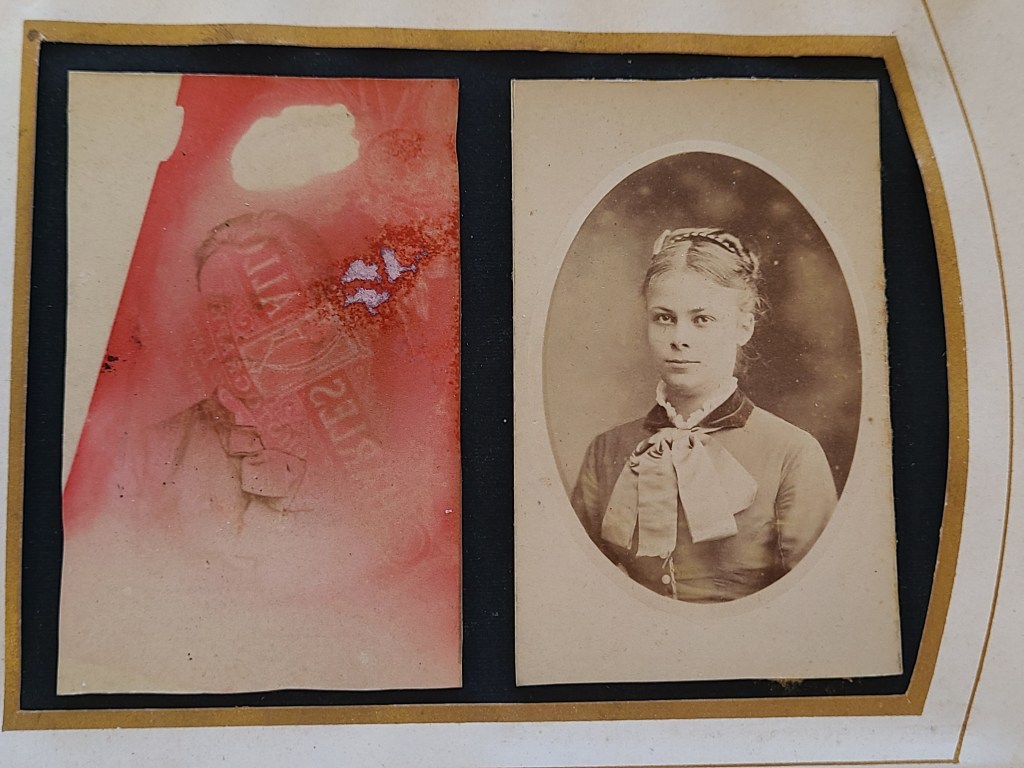 34 photographies et illustrations XIXe siècle, portraits (hommes, femmes, enfants, seul ou à deux) agencées par ressemblance, degré d’usure ou par doublons.