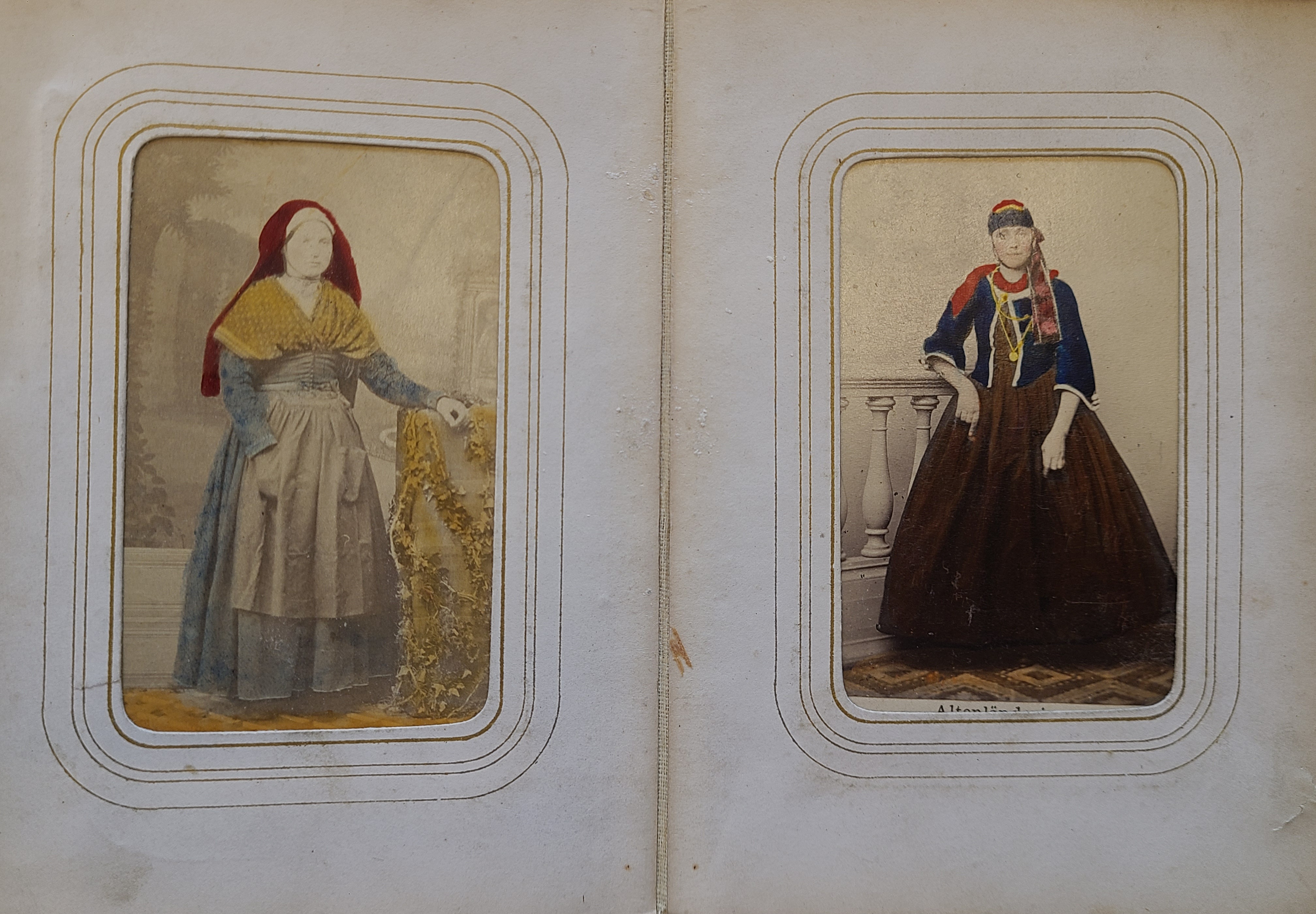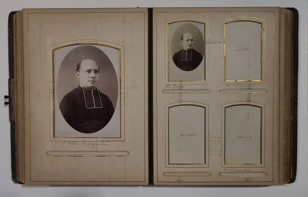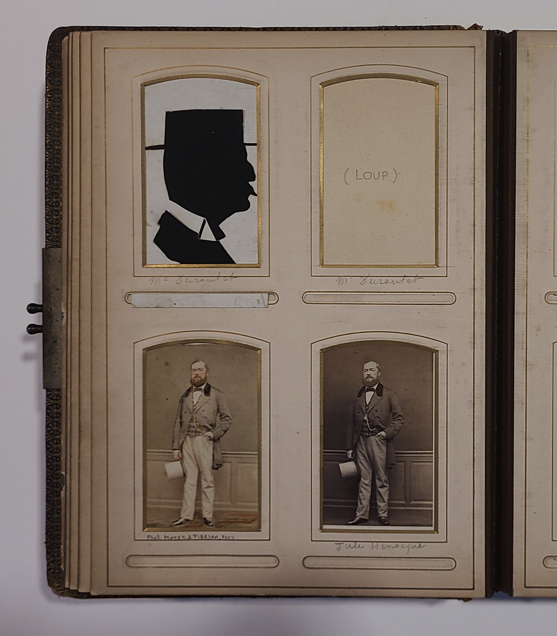 34 photographies et illustrations XIXe siècle, portraits (hommes, femmes, enfants, seul ou à deux) agencées par ressemblance, degré d’usure ou par doublons.