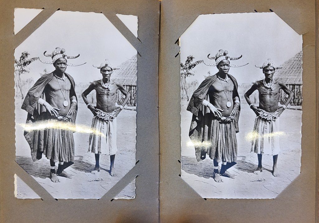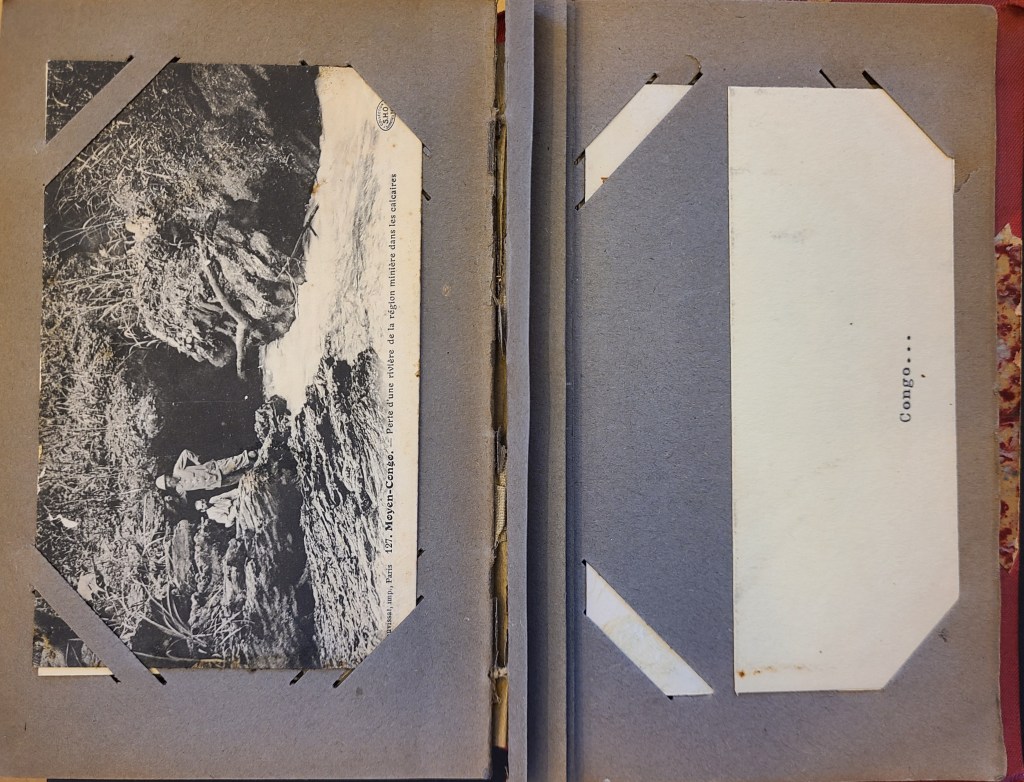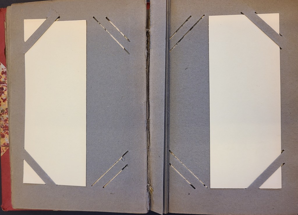 Album photo de 15 planches de carton fort, grises ajourées de part en part (1 ou 2 fenêtres par page).