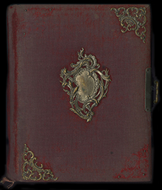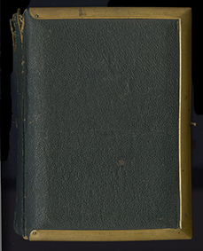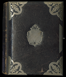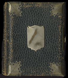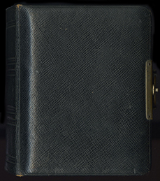 Couverture cuir à gros grain, noir ; fermoir métallique complet et fonctionnel ; coins renforcés, emblème centrale et cabochons métalliques ; tranches dorées ; reliure partiellement décollée, premières et dernières pages mobiles ; une seule garde au début du livre, carton fin, jauni, motif bouquet de fleur, détachée de la reliure ; degré d’usure important.
