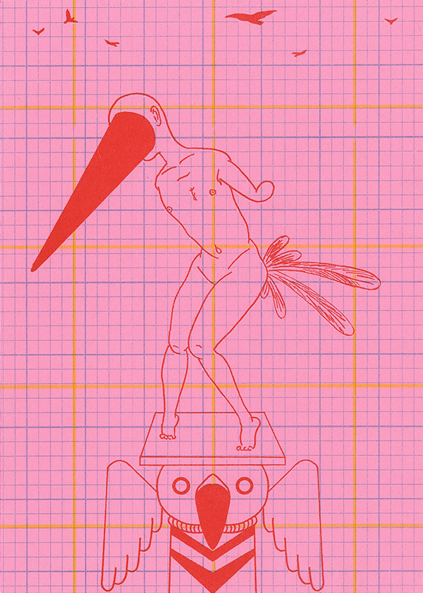 – 1 f. ; 21 x 14,8 cm, imprimée en risographie en rouge, jaune et bleu sur papier rose de fort grammage.