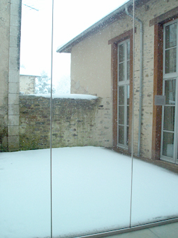 Pour la Salle des conditions atmosphériques, il réactive un projet des années 70, une œuvre minimaliste, trace éphémère d’un moment exposé. Il s’agit ici d’une vitre carrée trouvée dans les réserves du cdla. Le geste est simple, la vitre (miroir) est posée au sol de manière à créer une image. Une image en mouvement, un reflet difficile à lire. Le miroir habituellement véhicule de narcissisme, n’offre ici qu’un vide à contempler. Il laisse percevoir un mouvement, un moment instable, le passage des nuages. Le miroir devient tableau, il explore les conditions spatiales, visuelles et temporelles du paysage. Malgré les mouvements quasi incessants qu’elle enregistre, cette œuvre, reste très épurée et dégage un sentiment de calme forçant à la contemplation.