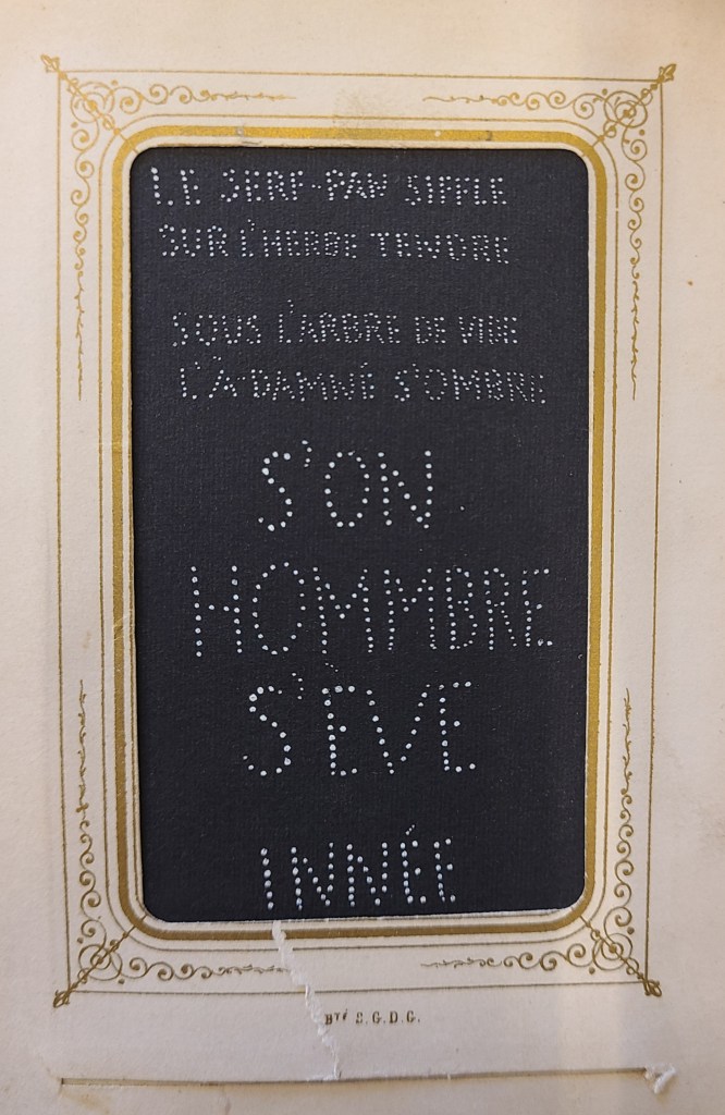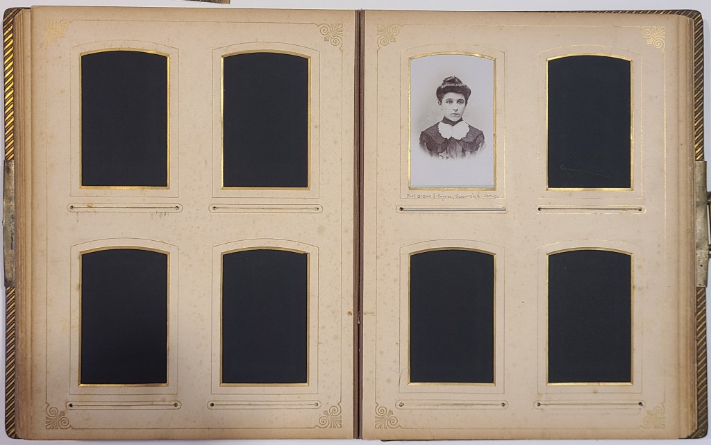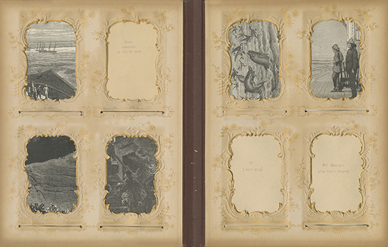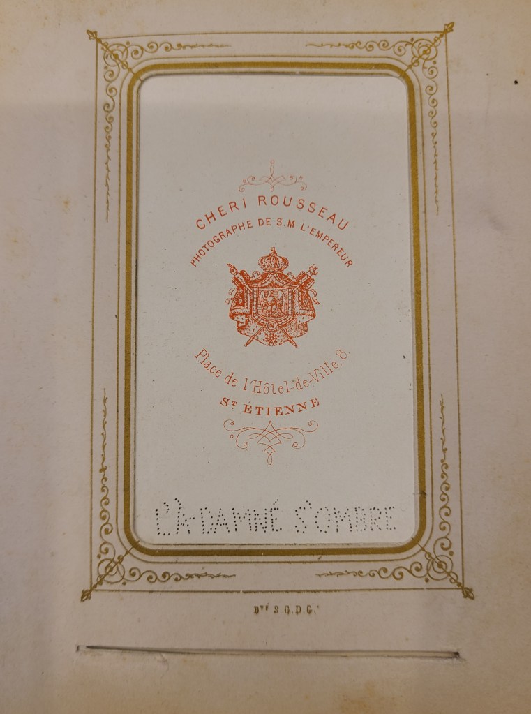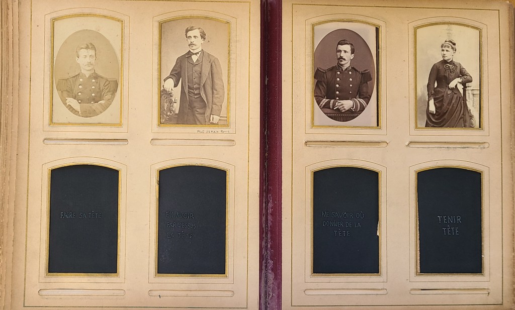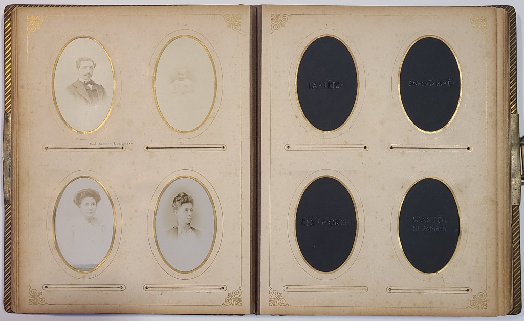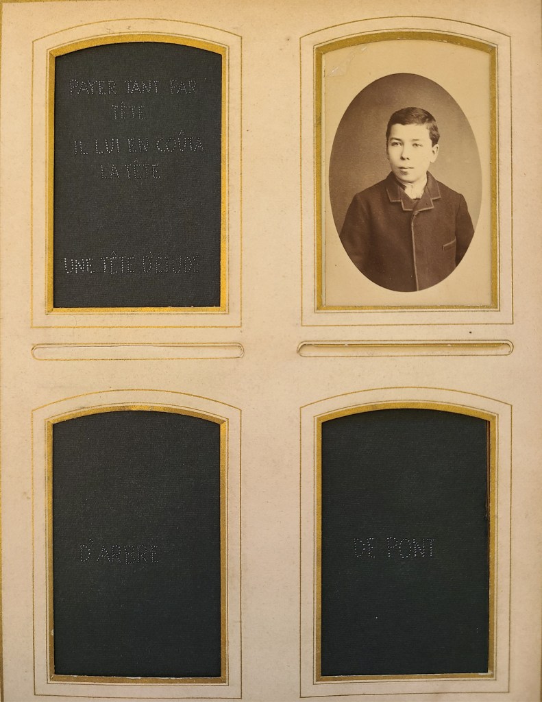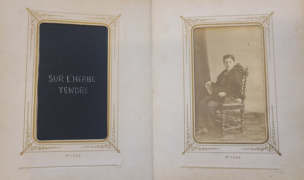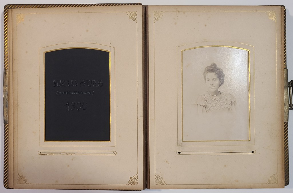 Certaines photographies sont d’un format trop petit pour les ajours dans lesquelles elles sont glissées, elles sont alors glissées dans le coin inférieur droit, sans y être collées.