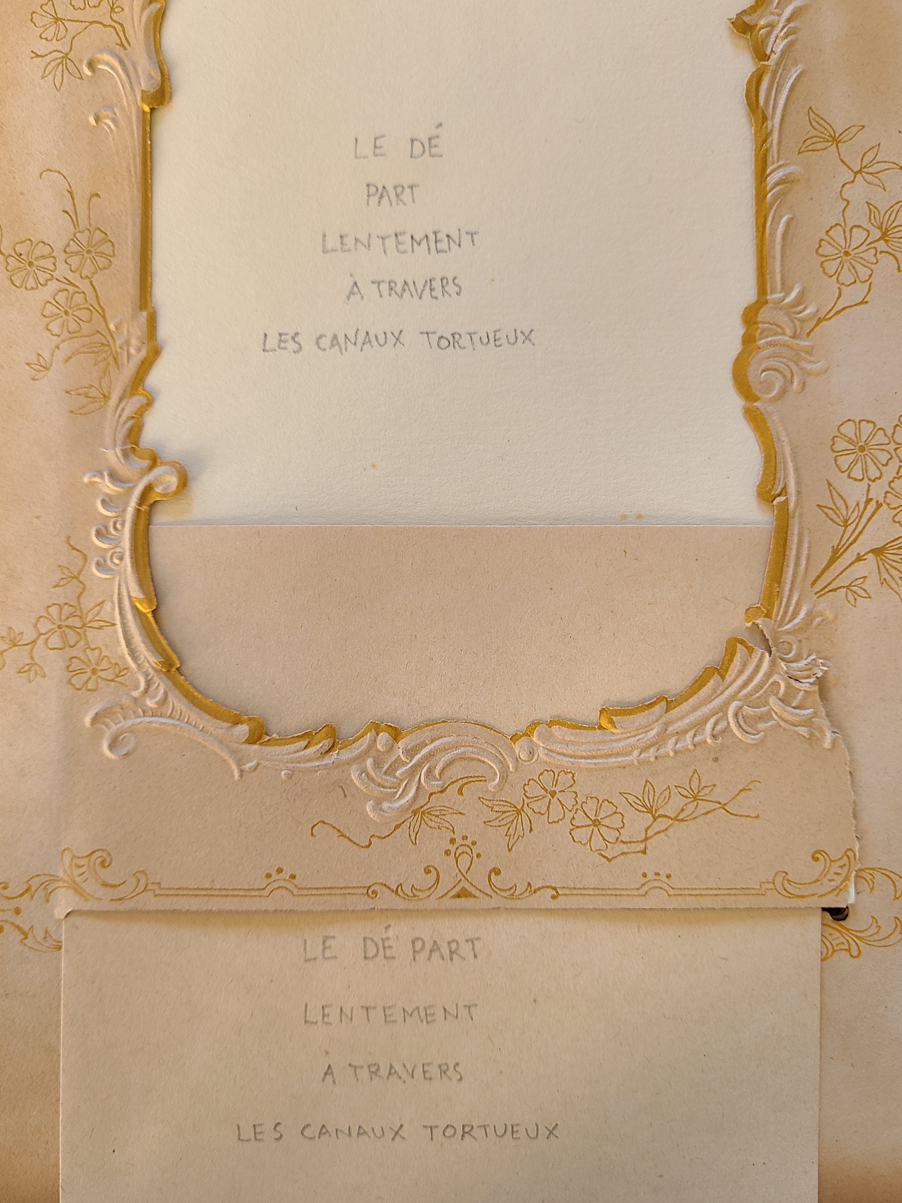 Textes autographes à la mine de graphite, lettres capitales, en périphérie des ajours.