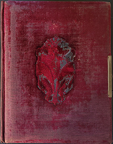 Couverture en chagrin brun/marron ; gardes vertes motif floraux ; reliure tissu rouge ; fermoir métallique entier et fonctionnel ; tranches dorées.