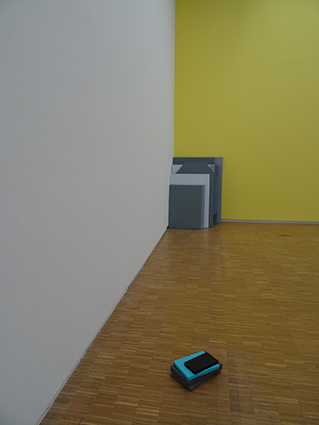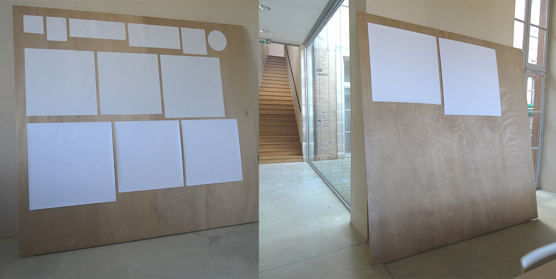 un mot sur ce qui est là mais pas dans le livre, la pile de tuiles et la pile de toiles. l’une et l’autre en attente. la pile de tuiles, blanchies à la chaux, sera déposée dans un courant du bassin d’arcachon côté cap-ferret fin septembre. l’une et l’autre de passage. une fois récupérées, les tuiles seront grattées pour récolter le naissain de l’huître, puis empilées jusqu’à l’année prochaine. à la fin de l’exposition les toiles exposées regagneront la pile, seront plus tard repeintes de la couleur d’un nouveau mur en vue de ré-actualiser la dé-finition/méthode, celle-ci ou une autre. ainsi de suite au fil du temps. des imprévus se produiront, les courants qui portent le naissain auront changé, il passera ailleurs, les toiles auront à faire bonne figure sur un mur de béton brut, il faudra les désagrafer et les recouvrir d’une nouvelle toile, brute. les toiles et les tuiles vivront de nouvelles aventures, une tempête bousculera les tuiles, les toiles rencontreront d’autres regards venus assister à l’un des moments de ce présent de la peinture en fuite perpétuelle.