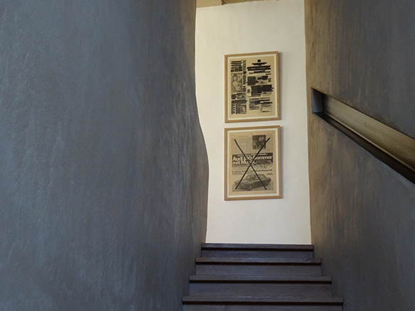 – 2 f. arrachées à un quotidien ; 57 x 40 cm, l’une barrée de 2 larges traits en croix tracés au crayon feutre noir ; sur l’autre tout le texte est rayé au crayon feutre noir, seules les images restent visibles.