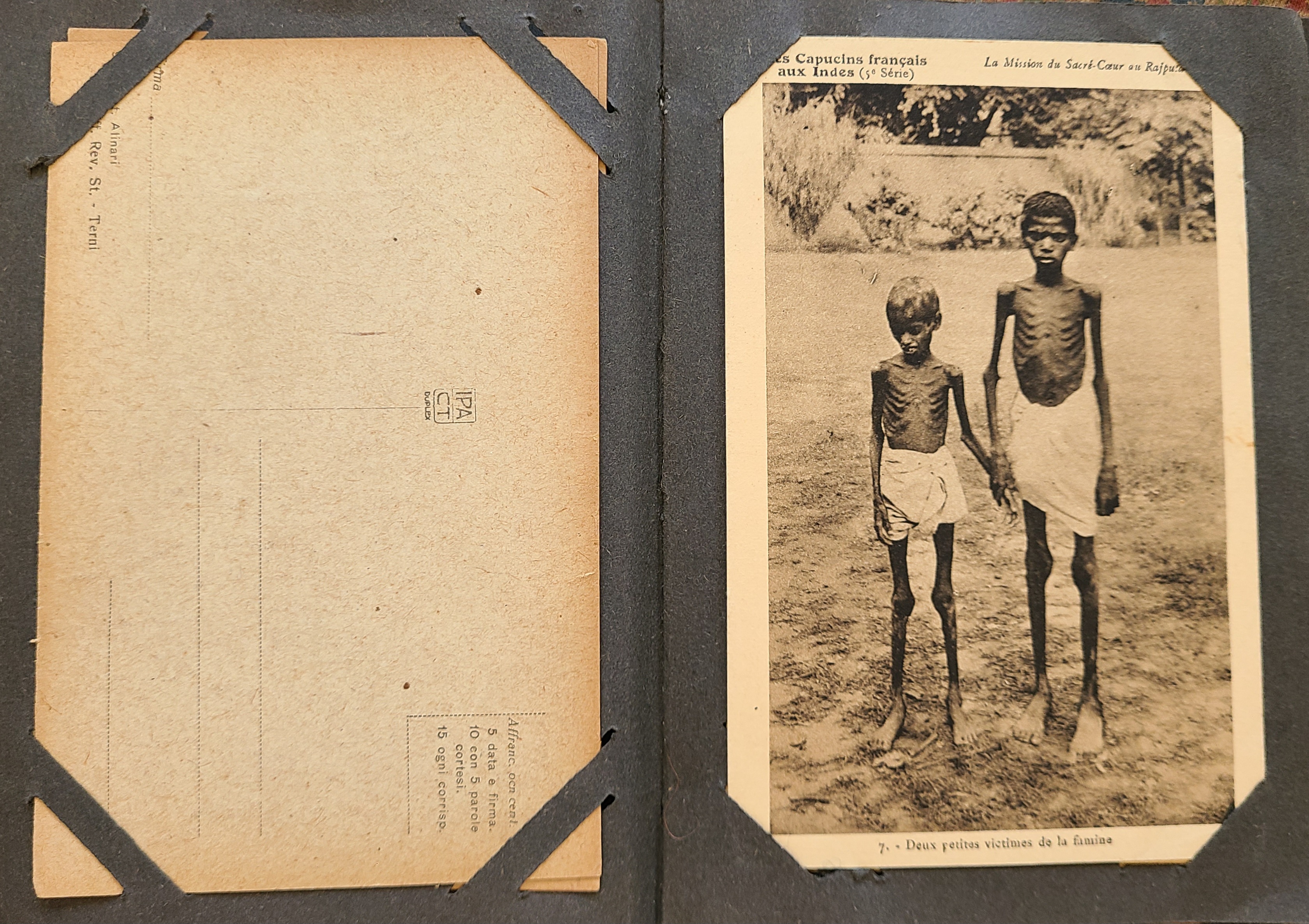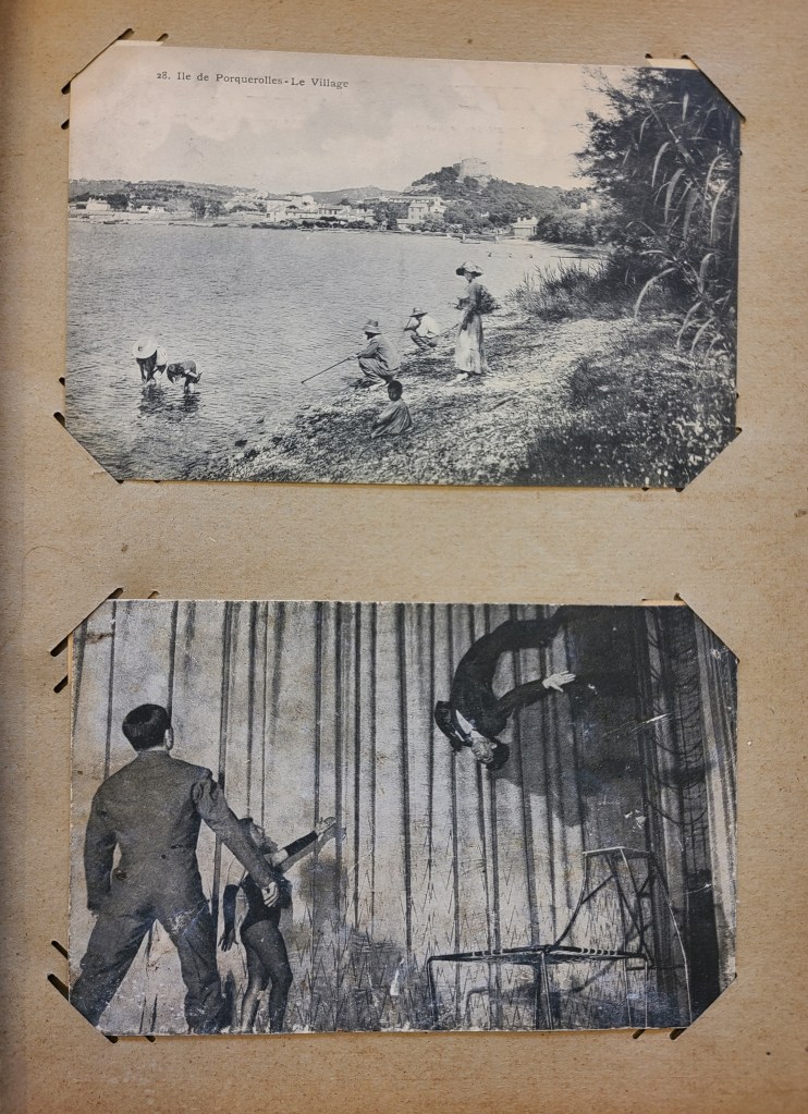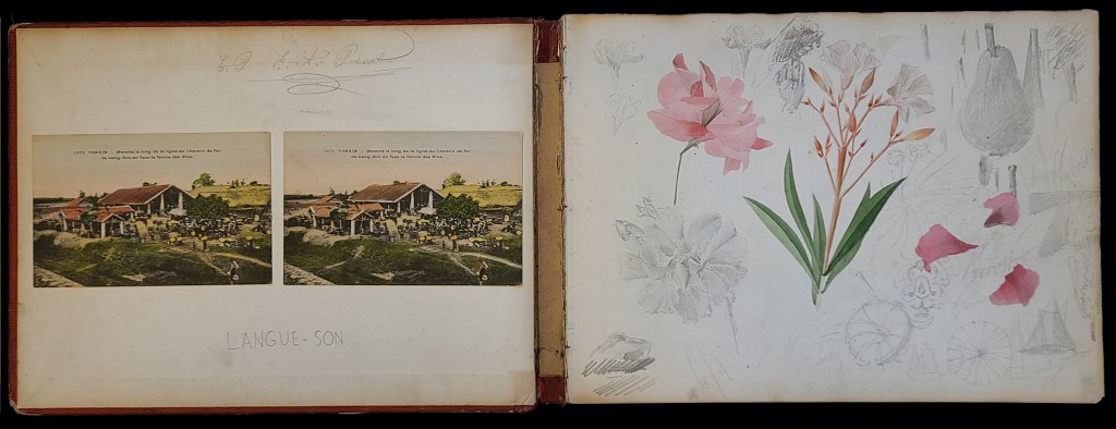 Au-dessus du titre autographe en lettres capitales à la mine de graphite : deux cartes postales colorisées, identiques, collées sur le premier contreplat («(27) TONKIN : Marché le long de la ligne du Chemin de fer de Liang-Son en face la ferme des Pins», Editions Victor Fiévet, ca. 1949-1954, Vietnam, photographie ethnique).