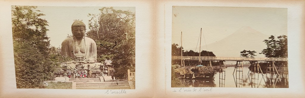 Album photo japonais sous forme de leporello de 25 volets, deux suites de textes différentes au recto ou au verso.