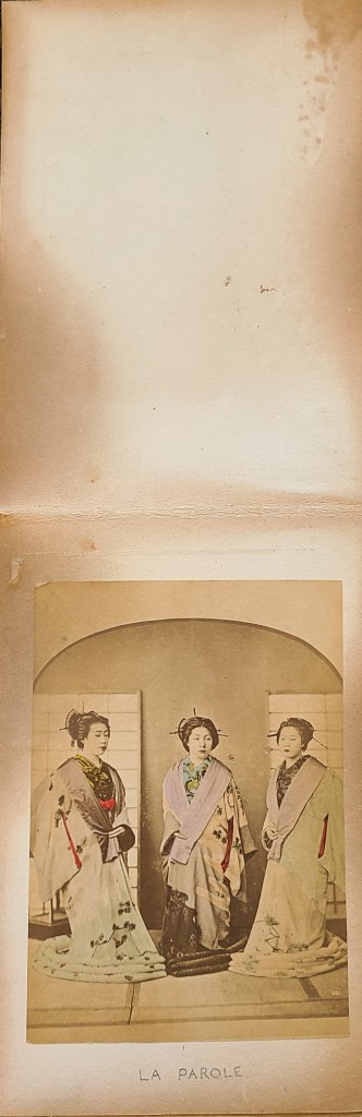 Photographies collées sur les doublures de carton blanc du leporello, enluminées par Micheline Catti ; 50 photographies, dont 25 paysages japonais (urbains, ruraux, sculptures, scènes de vie) et 25 scènes de genre autour des geishas et de leur quotidien.