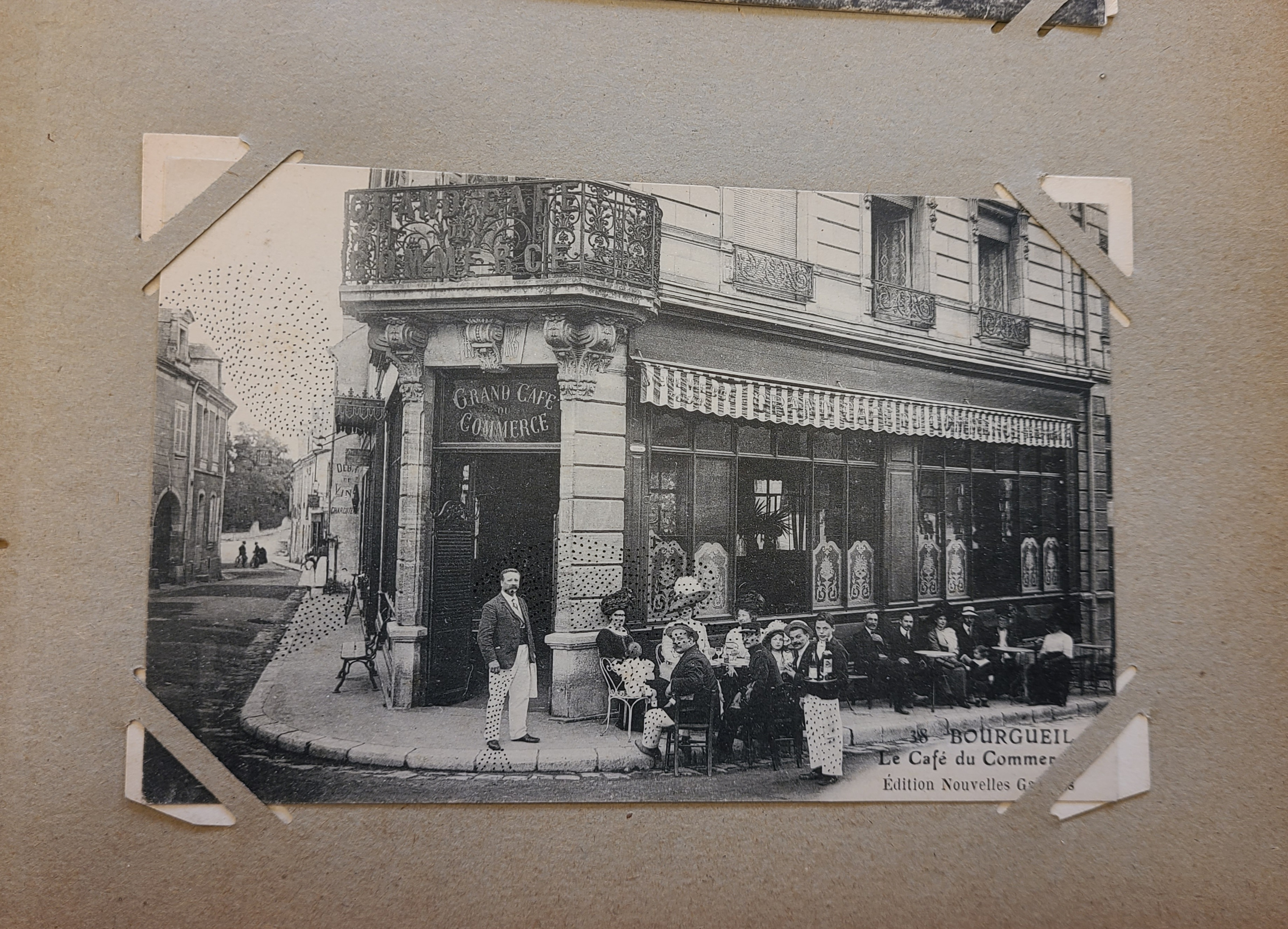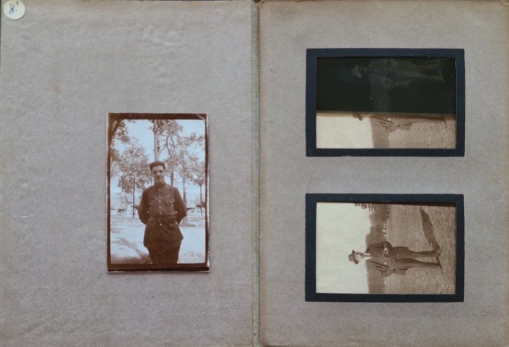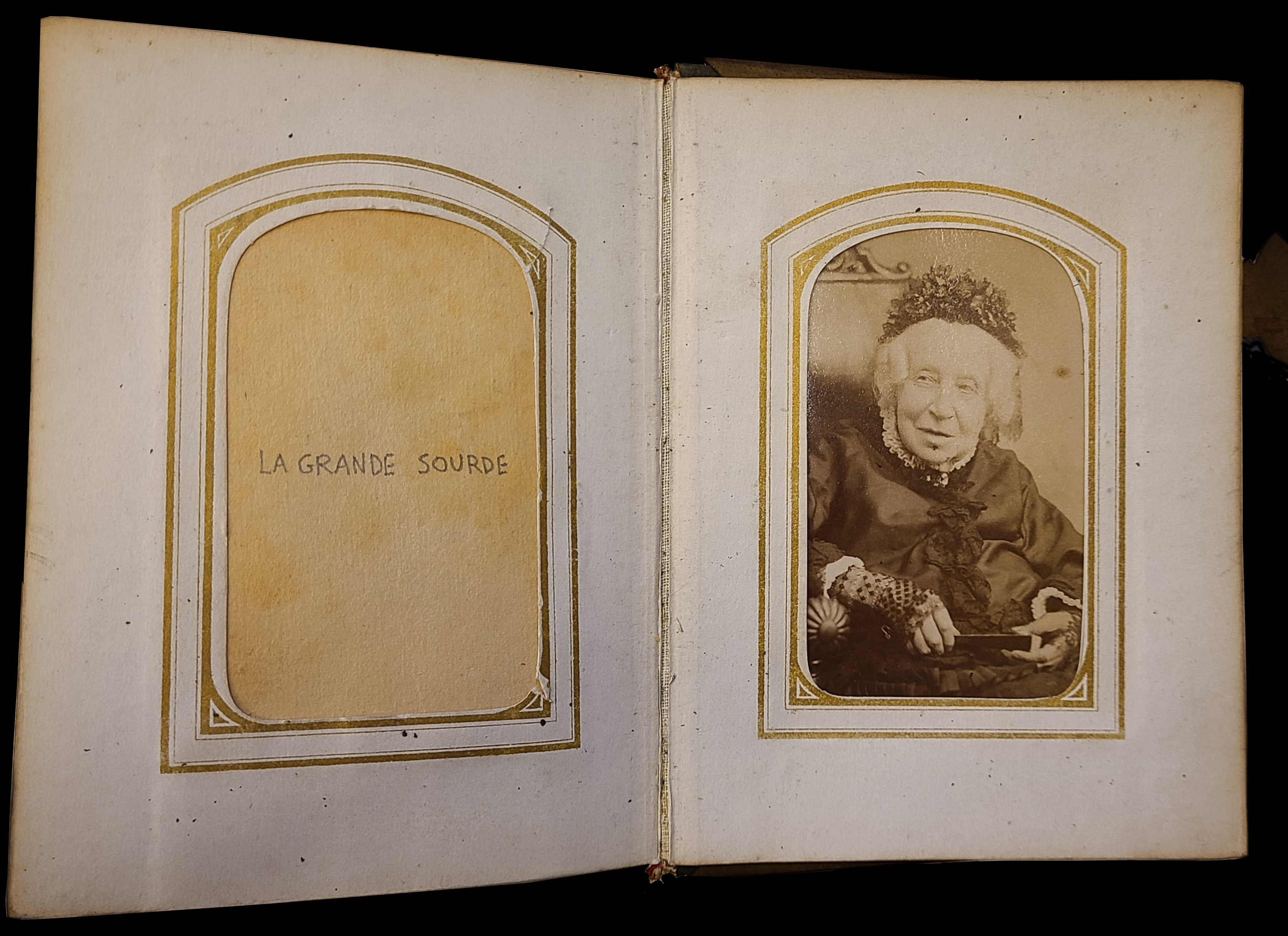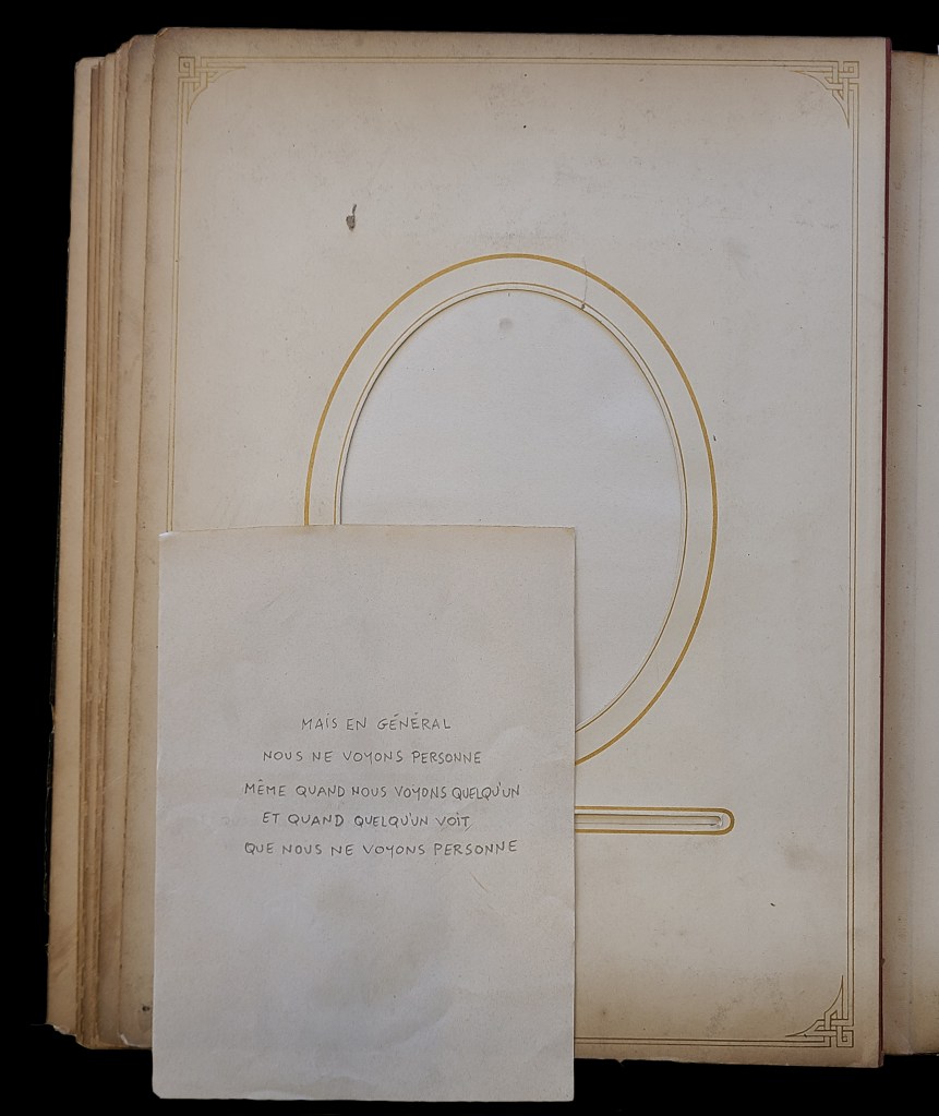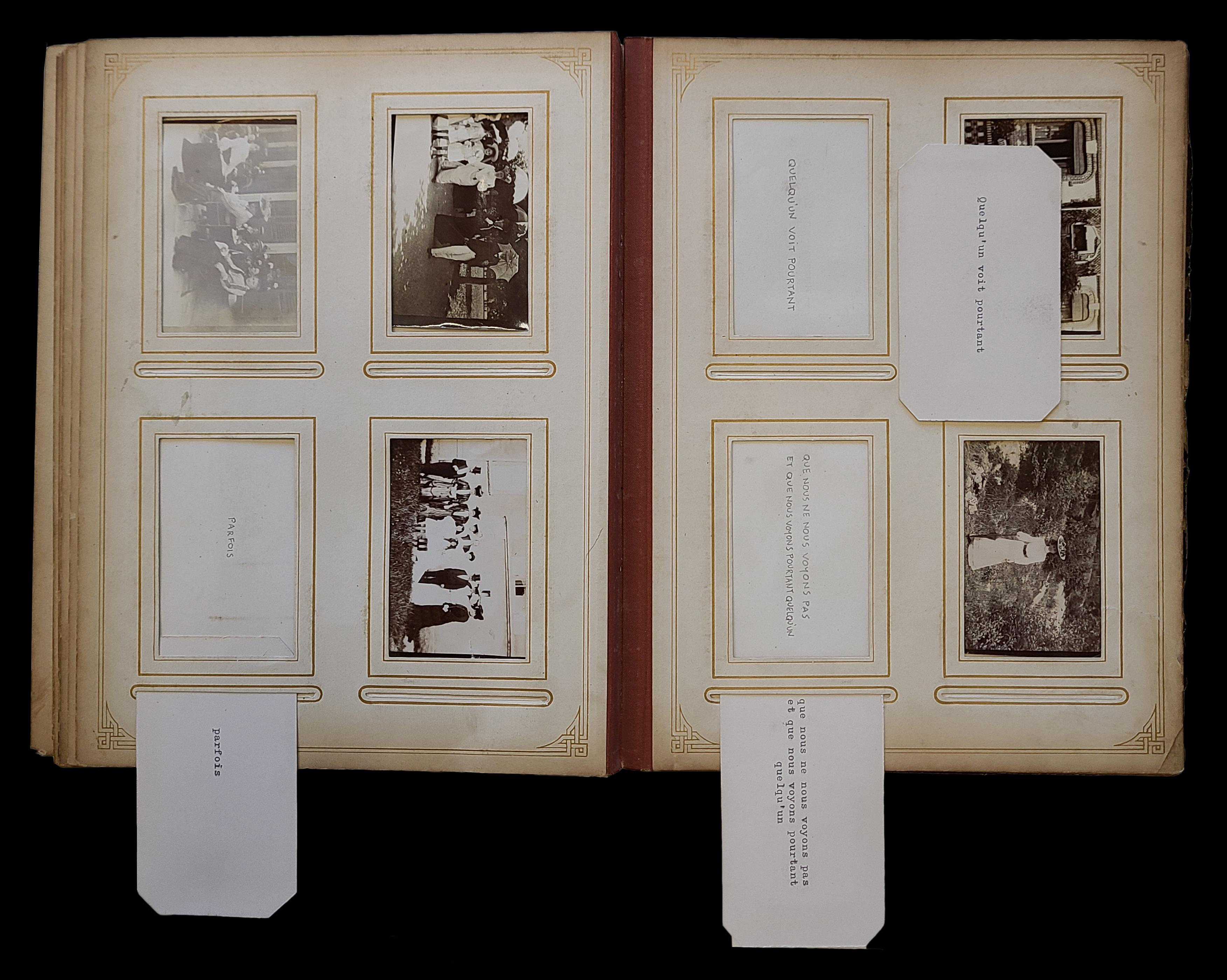 49 tirages photographiques format 7 x 4,5 cm sur papier fin, dans les ajours sauf un portrait de soldat, volant, glissé entre la couverture et la première planche (au dos, autographe : «zéro / coup de feu»), et un négatif de même format, identique aux photos de la première page et partiellement superposé au tirage dans le premier ajour ; photographies de monuments (châteaux de Fontainebleau, de Versailles, de Malmaison et de Chantilly), scènes en extérieur (portraits en extérieur, vues sur la Seine, forêt, paysages), 18 portraits d’un même homme (ca. 60 ans, moustache, costume sombre, chapeau, veste longue, fumeur).