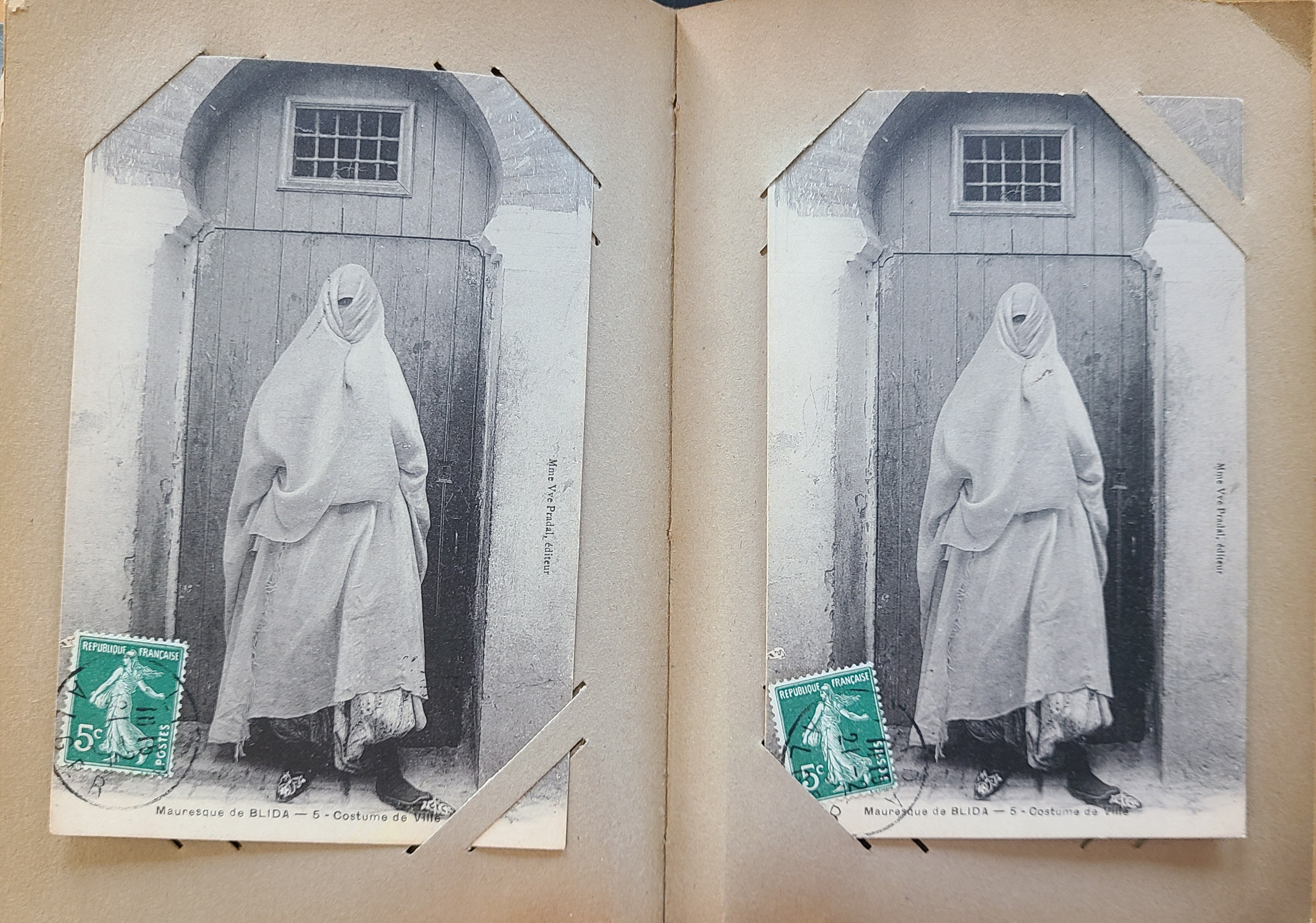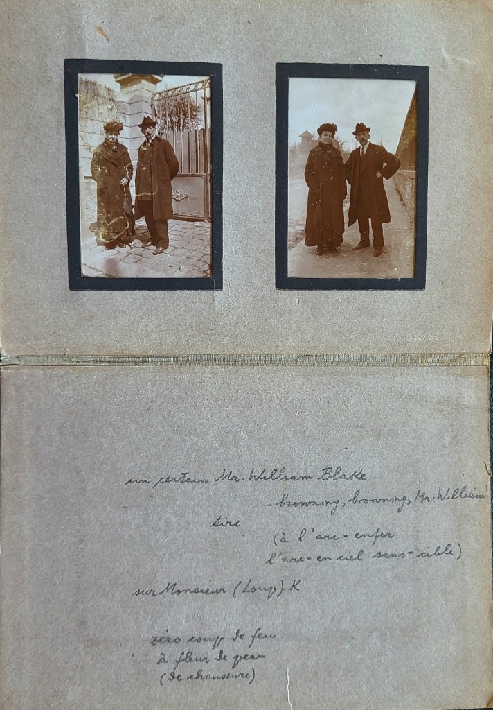 Inscriptions horizontales ou verticales selon l’orientation de la lettre en vis-à-vis ; page de titre autographe à la mine de graphite, en lettres capitales ; agencement presque régulier des manuscrits et photographies, avec, pour chaque double page, une carte postale et une carte retournée et écrite, sauf pour la page de titre, seule, 10 doubles pages de photographies.