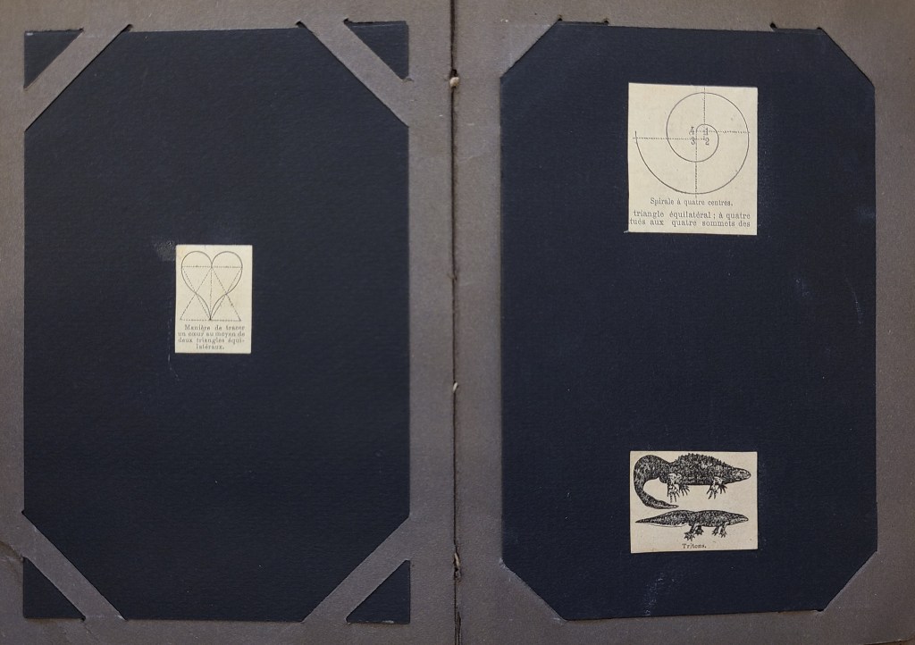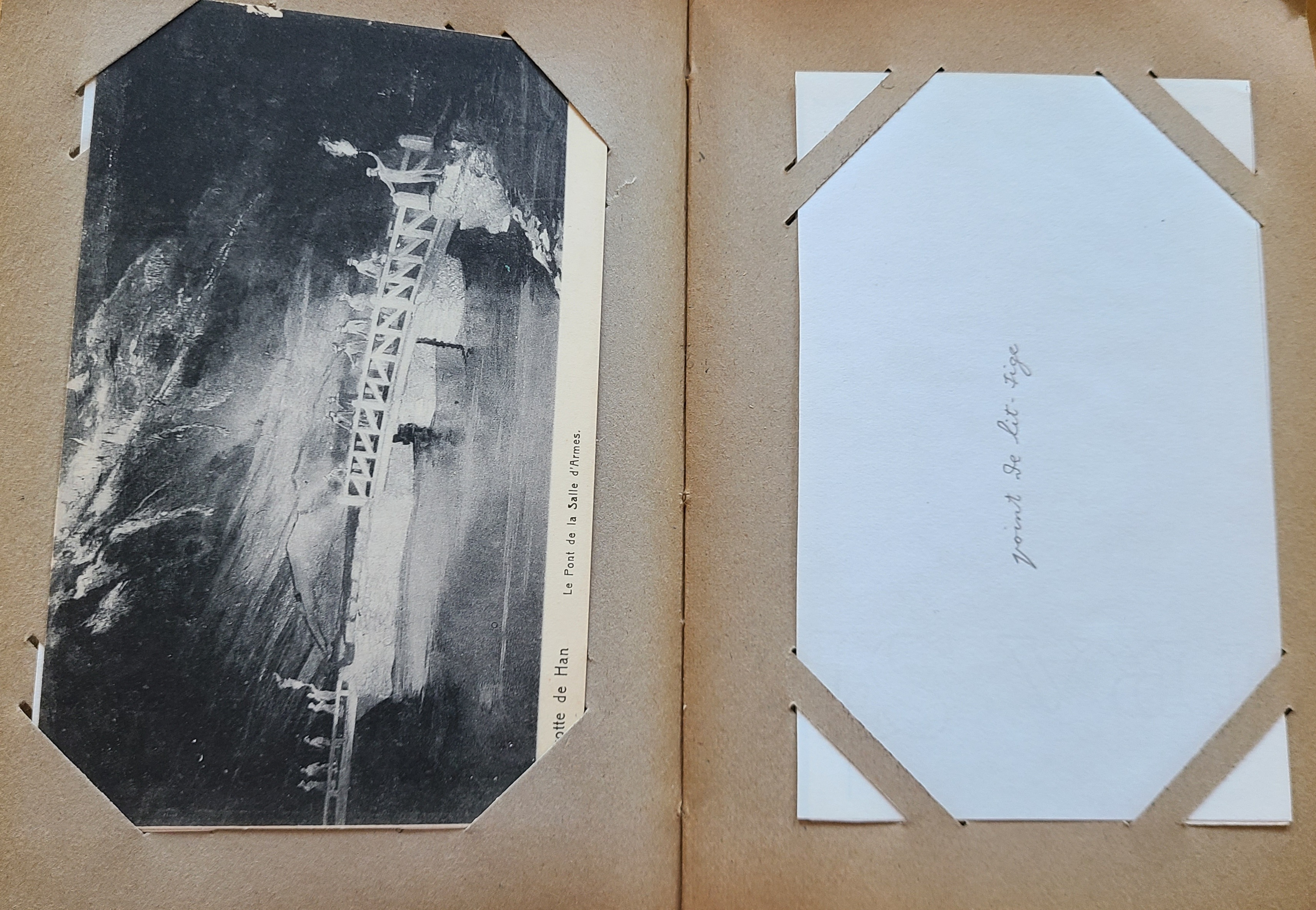 Organisation : 8 feuillets laissés vierges (deux séparés au début, puis 3 doubles pages vers la fin) ; orientation du texte (paysage/portrait) relative à l’orientation de la carte adjacente ; texte systématiquement en vis-à-vis d’une carte postale, sauf le titre ; textes seulement lors de la première section des photographies (itinéraire suivi d’entrée et de sortie de la caverne).