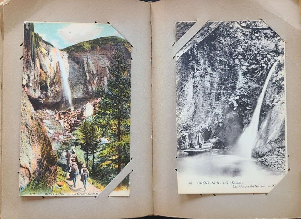 70 cartes postales diverses, dont une retournée sur la face écrivable pour le titre (42 photos reconstituant un itinéraire dans une grotte, le reste divisé entre photos de paysages de montagne avec cascade, de chemins ruraux ou urbains, et de photos ethniques ou de lieux d’extravagances).