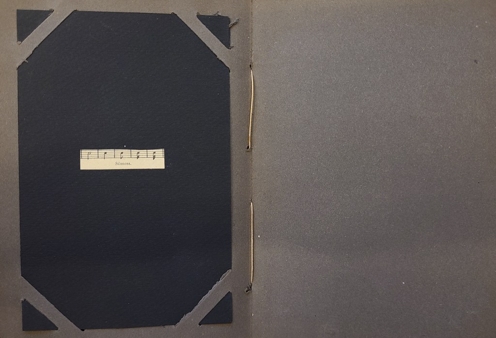 Livre collage à partir d’un album de cartes postales de 50 planches de papier fort gris, deux encoches à chaque coin.