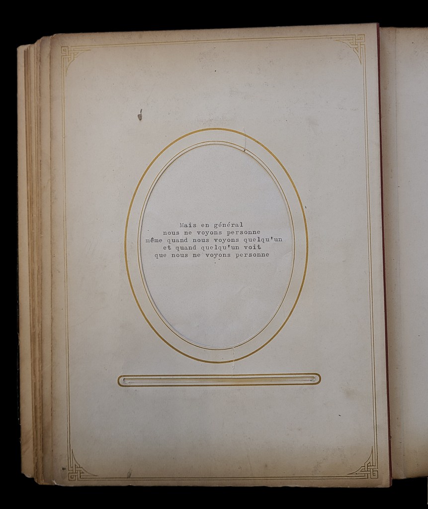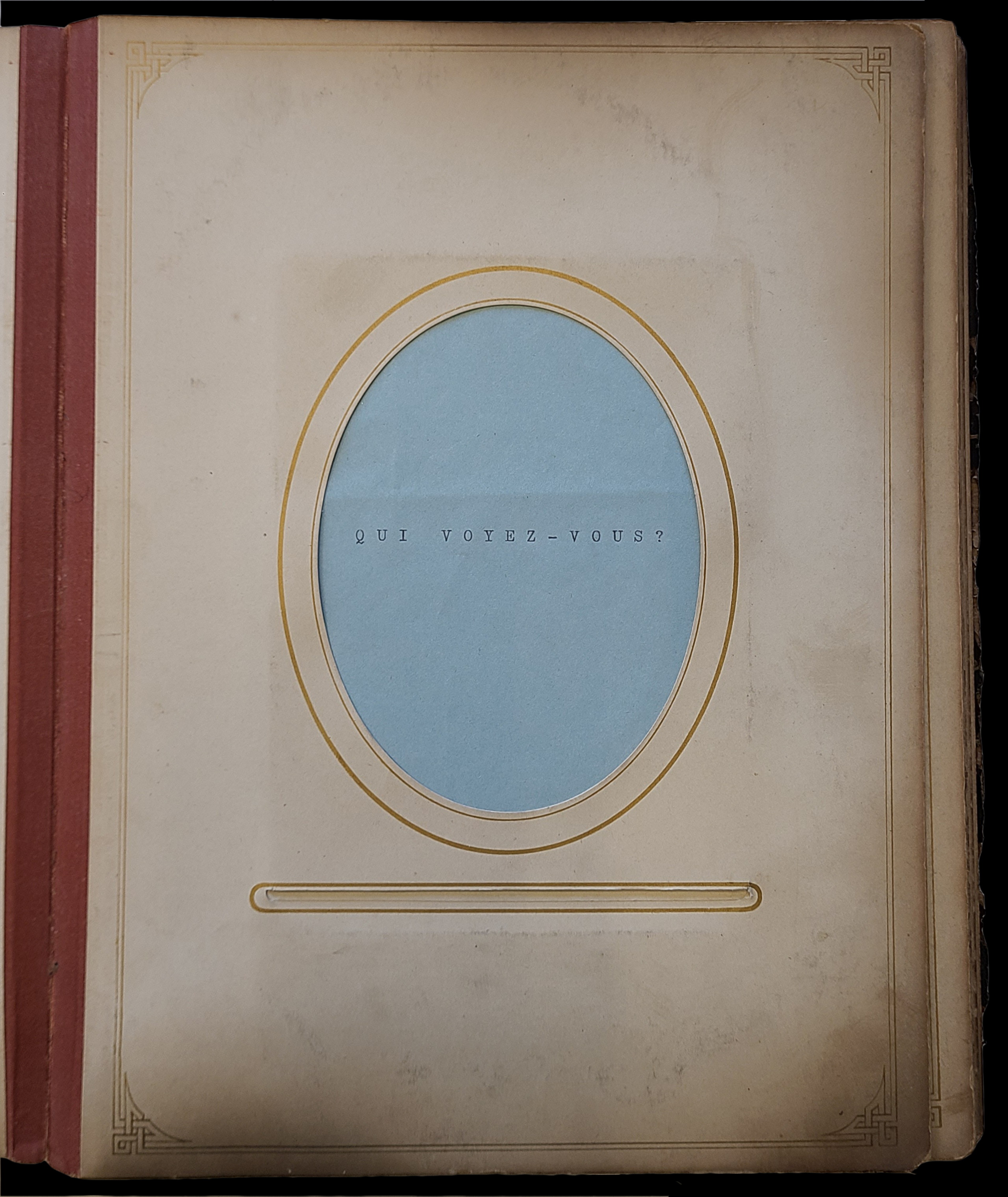 Album photo de 8 planches de carton fort, ajourées de part en part (1 et 4 fenêtres par page, ovales ou rectangulaires), dorures sur l’encadrement des ajours, de la page et des fentes d’insertion.