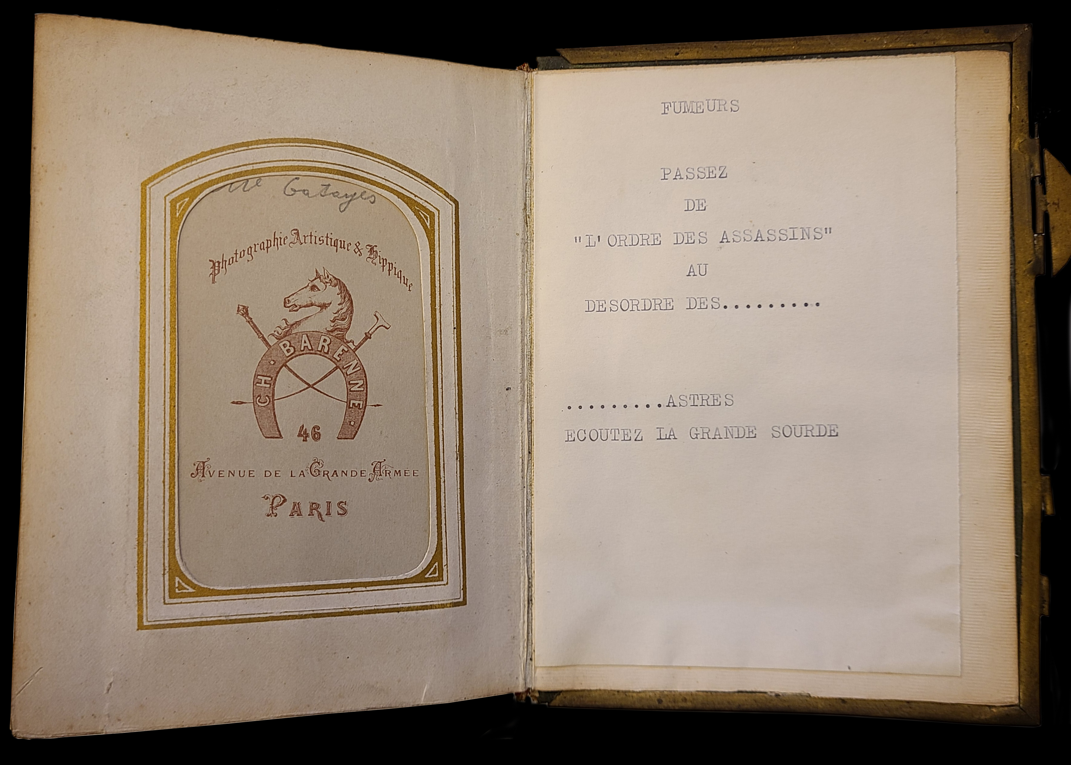 non daté [1962-1963], ex. unique. – 24 p. ; 30 x 24 x 3 cm ; (P) – album photo, 32 clichés ; texte dactylographié sur supports divers, texte autographe au verso ou sous les encarts. – couv. cuir noir frappé ; 8 planches, carton fort ajouré. Fonds Ghérasim Luca, donation Micheline Catti ; inv. n° 100 23.