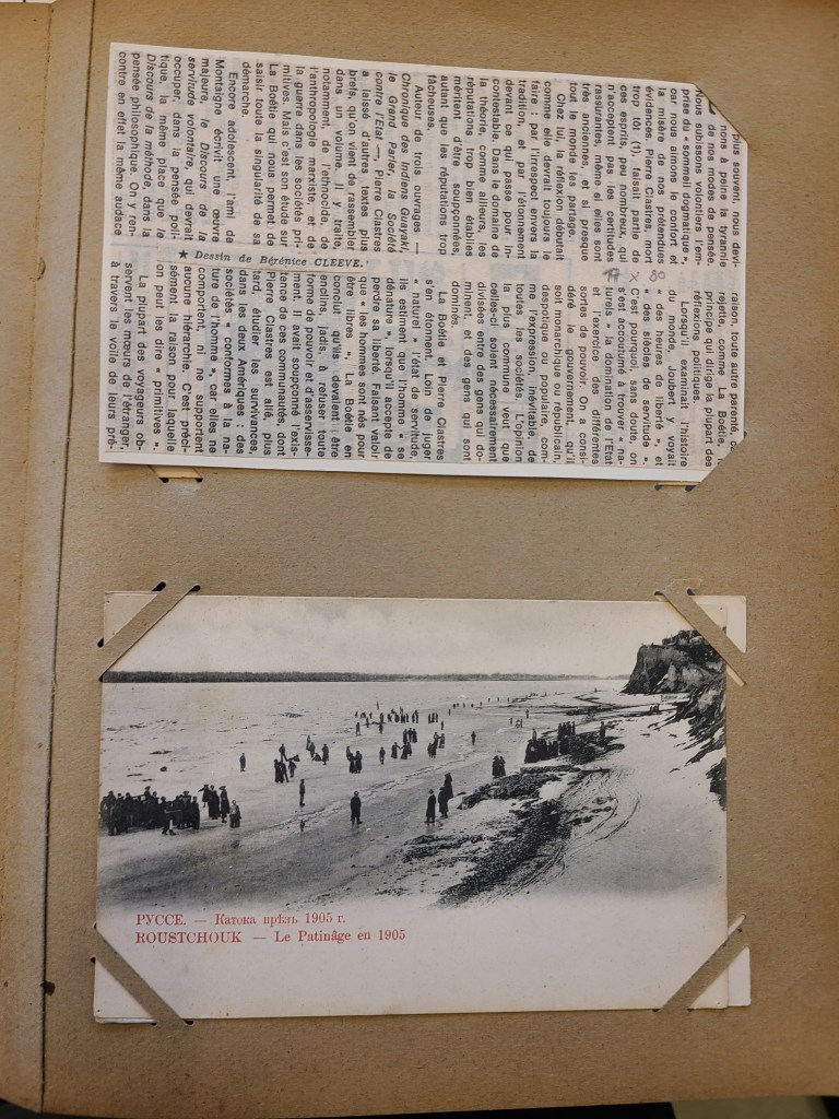 Inscriptions horizontales ou verticales selon l’orientation de la carte en vis-à-vis ; page de titre autographe à la mine de graphite, en lettres capitales ; agencement presque régulier des manuscrits et photographies, avec, pour chaque double page, une carte postale et une carte retournée manuscrite au dos, sauf pour la première avec une carte volante en vis-à-vis du titre, quatre doubles pages réservées aux photographies, et une double page réservée aux textes.