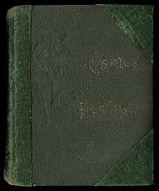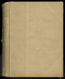 Couverture en percaline crème frappée, étiquette effritée au dos, coiffes usées ; gardes en papier fort, autocollant «S» sur la première garde, notation non-identifiée et signature autographe à la mine de graphite sur la dernière garde.