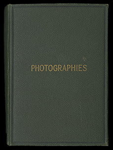 Couverture simili cuir vert, gros grains, dorure «PHOTOGRAPHIES» centrée, encadrement noir frappé, très bon état.
