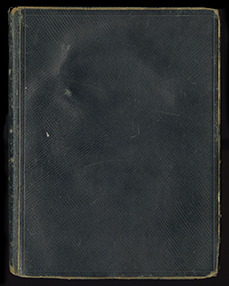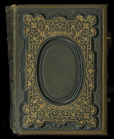 Couverture cuir noir frappé, relief et filet doré sur le premier plat et le plat arrière, inscription de «relatives» en dorures sur le dos, tranches dorées ; tranches de couverture et coiffes usées, premier plat gondolé ; gardes de papier fort, doublé d’un papier blanc moiré et strié, deuxième garde de carton fin, «Album» calligraphié style victorien et motifs floraux.