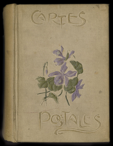 Couverture en percaline crème, gaufrage typographique «cartes postales» et motifs floraux peints (violet, vert, brun), tachée et brunie, dos décollé, volume à demi déboîté, quelques réparations d’époque au scotch sur les encoches arrachés ; gardes papier fort gris.