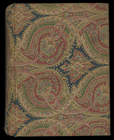 Couverture en percaline motif imprimé style boteh ; dos décollé, volume à demi déboîté, quelques réparations d’époque au scotch sur les encoches arrachés ; gardes papier fort gris.