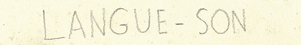 «[premier contreplat, deux cartes postales, photos ethniques du Tonkin collées] LANGUE-SON /// [croquis floraux, et végétaux dont quelques uns en couleur + tentatives de calligraphie signature] /// [inscription «M N Monsieur Prevost – Jardinier – fleuriste» + croquis bouquets de fleur] ANTI-NOM-ET-MOMIE (2) /// [croquis bouquet de fleur, dont deux en couleur + deux portraits rapides, dont un caricatural + tentatives de calligraphie «madame / d / madame / madame / monsieur / mademoiselle / m» + croquis oiseau] /// [6 études de nez au fusain] l’humanité souffle (5) /// [deux études de nez, une d’oreille, au fusain] la féminité vibre (7) /// [deux études d’oreilles au fusain] oreille d’avant nez (9) /// [deux études d’oreilles au fusain] avant-né (11) /// [une étude d’oreille au fusain, orientation portrait] personne (13) /// [une étude de bas de visage au fusain] son d’âge (15) /// [une étude de bas de visage au fusain, expression neutre] son d’ange (17) /// [une étude de bas de visage au fusain, léger sourire] son d’ange heureux (19) /// [une étude de voûte plantaire, au fusain, orientation portrait] cri de plante (21) /// [une étude de pied plié, au fusain, orientation portrait] cri de ch’ose (23) /// [une étude de pied, plongée, au fusain, orientation portrait] percant (25) /// [une étude de pied, avec sandale, plongée, au fusain, orientation portrait] sens-cri (27) /// [deux études de pieds, un en sandale, l’autre nu, plongée, au fusain] en son double aimant / ,,aimant’’ ch’ose ,,aimant’’ verbe (29) /// [une étude de main appuyée, au fusain] et prise d’oracle soudain : perte vive (31) /// [une étude de main sur une grappe de raisin, au fusain] v’ivre (33) /// [trois études au fusain, un rocher, un puits, deux buissons] son élément (eau sans voyelles) en dérive (35) /// [une étude de maison en ruine au fusain] ,,son’’ / résonne et s’appartient (37) /// [une étude, de maison et portail, une de branche, au fusain, orientation portrait] ,,élément’’ / aile aimant // ,,en dérive’’ ch’ose et ,,en dérive’’ verbe (39) /// [une étude de puit rectangulaire, et deux de feuillages et branche, au fusain, orientation portrait] l’antinomie FEMME dénude de nu-âge d’or la momie HOMME (41) /// [une étude au fusain de maison dans les bois, tronc fleuri et champignons au premier plan, orientation portrait] en tête de ,,raison’’, la tête de ,,marbre’’ le marbre acéphale et la maison (43) /// [étude au fusain d’un arbre penché, végétaux et fleurs au premier plan, orientation portrait, texte entre les deux éléments] l’arbre de vide (45) [une étude au fusain de pont et arbre au dessus d’une rivière, une étude de rocher] et l’arc-en-eau (47) /// [une étude au fusain de portail de bois brisé, une d’arbre, orientation portrait, texte au dessus des études] quittent l’arbre de vie pour l’arbre vie de… (49) /// [étude au fusain d’une branche d’arbre têtard, orientation portrait] à quitte ou double / para-lit et sans ciel (51) /// [étude au fusain d’une branche et de feuillages, orientation portrait] vague écho d’écho-vague (53) /// [étude au fusain d’un buisson type if, orientation portrait] écho de feuille (feu-œil) à l’oreille (l’or-œil) d’Orphée (d’or-fée) (55) /// [étude au fusain de branches et feuillages] forêt à l’orée des corps (57) /// [étude au fusain de branches et feuillages d’arbre résineux, orientation portrait] écho des corps (59) /// [étude au fusain de branches et feuillages] échorps (61) /// [étude au fusain de branches et feuillages] à corps perdu accord perdu (63) /// [étude à la mine de graphite du château de Montigny-le-Gannelon] S’ÈVE D’HOMMBRE (65)»