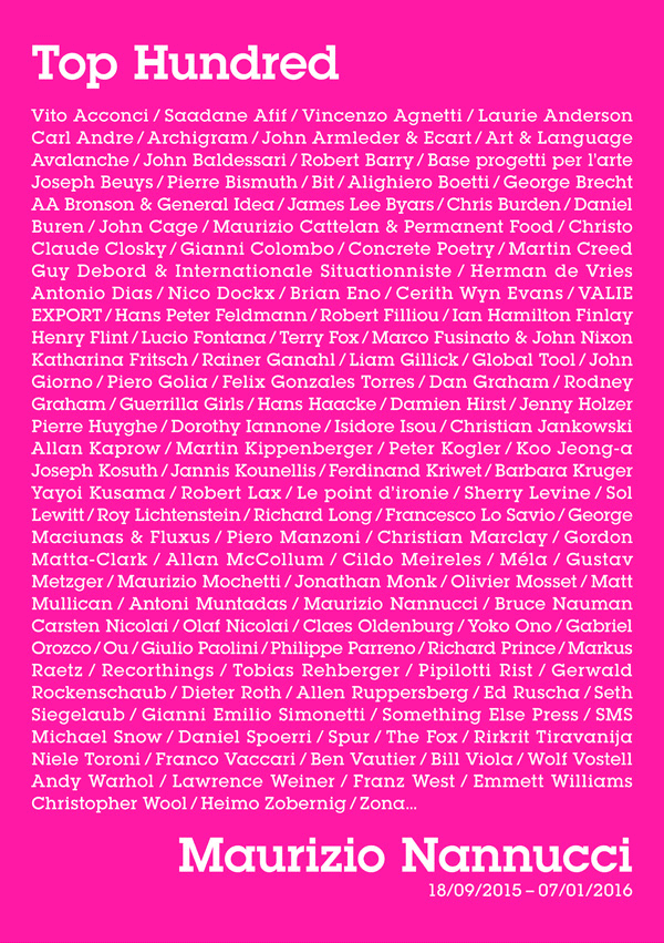 James Lee Byars, Antoni Muntadas, Lawrence Weiner, John Giorno, Anne Waldman, Kristin Oppenheim, Maurizio Nannucci.