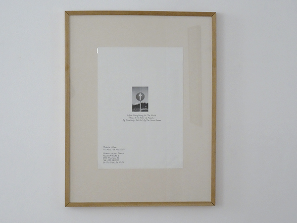 Paul Armand Gette a fait don au cdla de l’ensemble des originaux reproduits dans le livre Über die Verwirrung / De la perturbation publié en 1981 par AQ Verlag à Dudweiler – Erwin Stegentritt éditeur, soit 85 tirages photographiques en noir et blanc, 5 dessins, 5 tirages en photocopie tous montés sur des feuilles de carton blanc format : 30 x 25 cm (plus 1 planche de titre portant le texte manuscrit à l’encre noire de la perturbation. ensemble des documents du livre qui forment une exposition et ne peuvent être séparés). Chaque planche comportant une photographie est titrée et signée à l’encre noire.