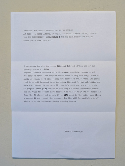 Commissariat de l’exposition : Peter Foolen en collaboration avec Peter Liversidge. L’exposition a été montrée une première fois au Van Abbemuseum à Eindhoven du 3 novembre 2015 au 22 janvier 2016 sous le titre Peter Liversidge – Surface Mail. The Postal Objects of Peter Liversidge from the collection of Peter Foolen.